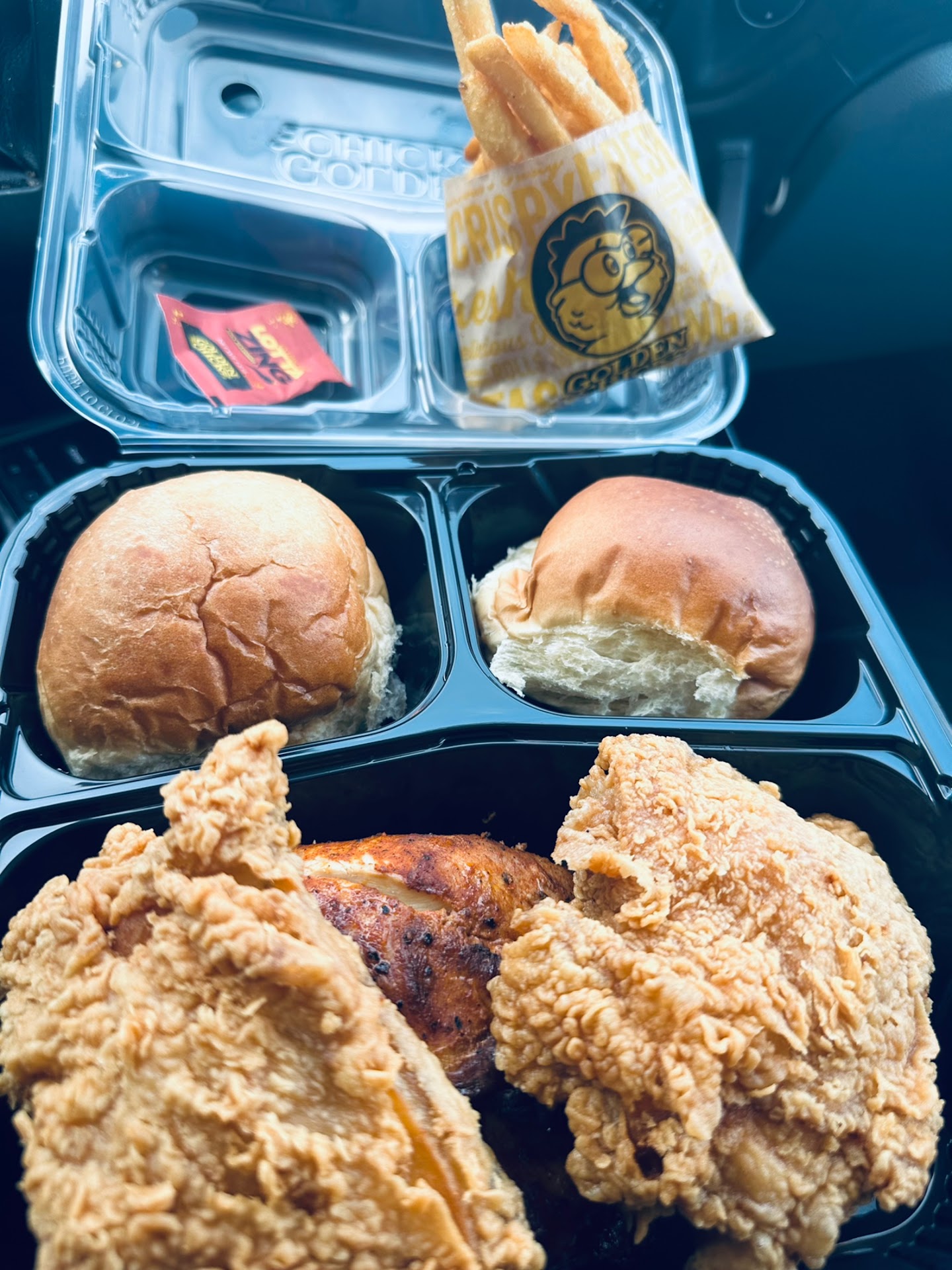 My first Golden Chick. I didn't want to eat at this chain for years, due to some reason that escapes me today. This location opened up near us and my wife talked me into it. I did not have the best first, second or even third experience, but I pressed on because the chicken is so good. The first time, I called in to find out if this location delivered (some do). I was greeted by some young man, when I asked if this location delivered I was told "NO, I done told you; we do not deliver. Stop calling!". I'm adult to know this young man did not grasp the concept that I may be an entirely different person that the one who has so clearly been bothering him; so I let it go and it has been a funny story for my family. Round two. We decided later that week to drive by and pick up dinner, this would be my first time actually eating here. We pulled up to the drive thru and we were greeted by a confused, slower(not dumb, think, Spicoli from Fast Times) and LOUD(the speaker was turned way up) "dude". After repeating the first item several time and breaking it down into smaller parts, I figured out we needed to speak simply and slowly. We painfully ordered for the whole car and pulled out of the drive thru. I asked my wife if they at least got the food right, and she checked; everything was in order. She then popped a roll into my mouth, rolls that felt were redundant and not needed while ordering in the drive thru, and I was hooked. We got home where I had the chicken and fried with gravy, all was forgiven. The third time we went here the POS system was down and they had to do everything by hand. My wife likes to order substitutions, this complicated things to the point of breaking down an already broken system even further. We struggled to get an order in that day, but we did and the chicken was still amazing. I am of the opinion that all these opening hiccups are just someones elaborate plan to keep more of this amazing chicken form themselves. No matter how bad or misguided the service got, the chicken was...
