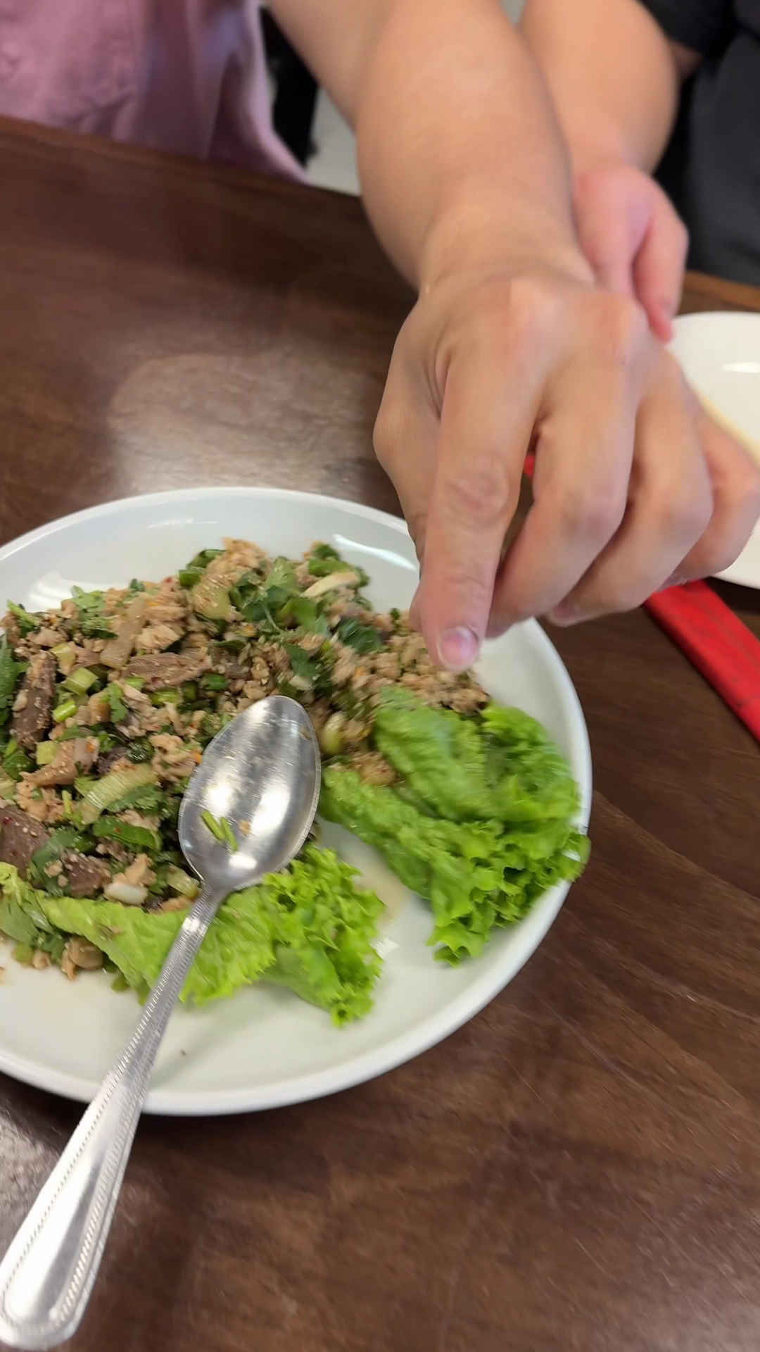 There was a mix-up with the larb, too. We ordered pork larb, but the waiter brought it out and said it was chicken. We double-checked with another waiter who also insisted it was chicken, even though our order slip clearly said pork larb. A third waiter ended up taking the dish back to the kitchen to confirm what it was, which was a bit confusing and frustrating.