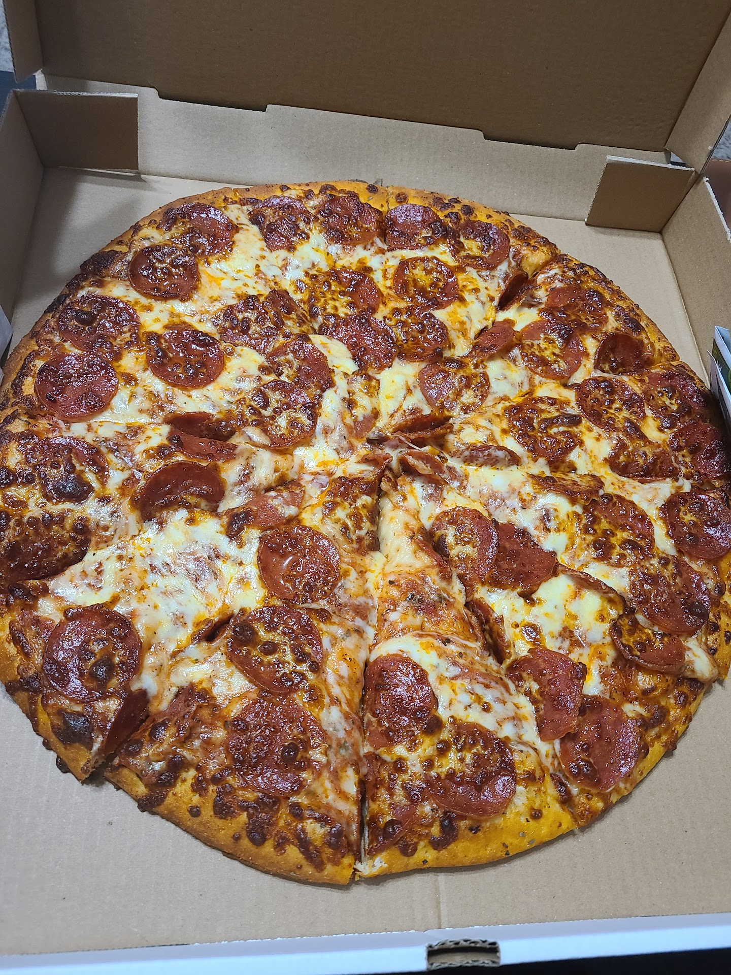 The pizza was good, with nice crispy melted cheese on top. The sauce wasn't overly acidic, and the dough was cooked correctly. Let me be honest here, this pizza isn't necessarily going to win any awards. But will I be ordering it again? Definitely. The price was good for the pizza, and I appreciate the reasonable prices for larger sizes unlike other pizza places. This was of Greek style pizza that I would get when I was younger in Connecticut, and still heads above a Domino's or Papa John's.