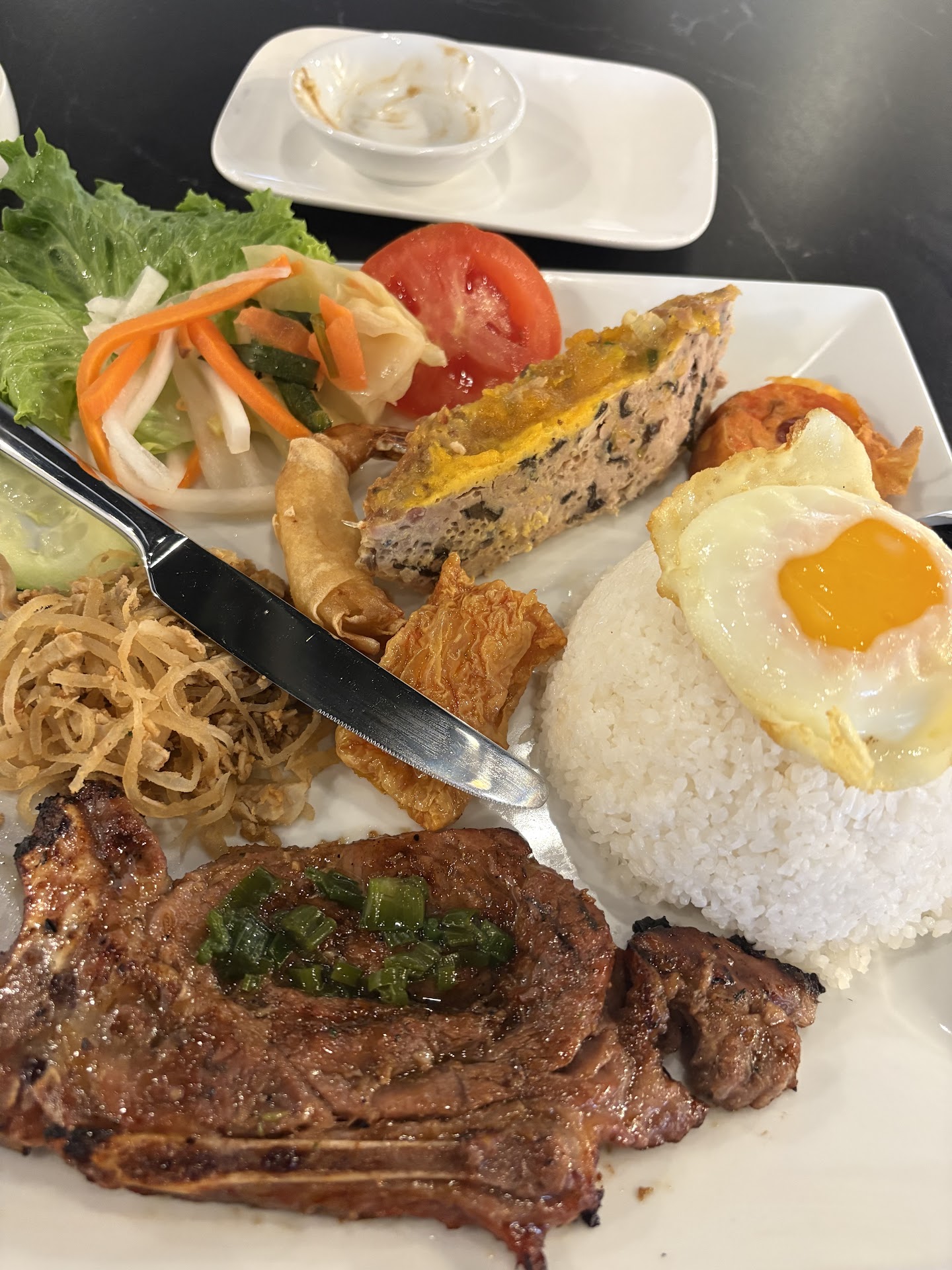 I found this place on facebook and decided to try out since the online pictures look amazing. It was Saturday lunch so the restaurant was full & wait was ~15-20 mins. No staff came to greet me when I walked in. They only came and walked me to my table after 15 mins. They were busy so the table I was seated at was not wiped down completely. It was sticky and there were food/sauce residue from previous party. Water came quickly and I was able to place my order. I then went to the restroom & person before me told me the toilet was clogged so she was not able to use it. I went in and saw that toilet was not able to flushed. I immediately felt grossed out and lost my appetite. When I returned to my table the fresh spring roll wraps I ordered came out but it was way below my expectation. The rolls were wet & soggy. The proportion of vermicelli, veggies, and protein were off. There were way too much vermicelli in the roll, making in bland and tasteless. The peanut sauce weren’t bad but they were nowhere near good. If the kitchen add crushed peanuts to the sauce, I think the texture would be better. Then came the main dish, the special combo broken rice. I appreciate that this restaurant actually uses broken rice and the rice were good quality. The grilled pork were tender, soft, and quite flavorful. However, it lacks the smokiness of charcoal grilled pork chop. I asked the server and she said she thinks it’s charcoal grilled but I was not able to determine if it was charcoal grilled or not. The egg was cooked nicely with runny yolk, however the rim could have been crispier. The pickled cabbage were nice addition to the dish as it helps degrease the palate from meat fat. However the pickled daikon and carrot were way too sour. The egg cake (chả trứng) and the pork skin (bì) tasted weird and outright bad, I had 1 bite of both and stopped. The shrimp paste wrapped in tofu skin (chạo tôm) was okay but it does not fit in this dish. The fish sauce (nước mắm) was bland and water down. This dipping sauce would be more suitable for a vermicelli bowl rather than a rice dish. Overall my experience were not great. After seeing the clogged toilet I just want to run out of there but had to sit and finish my meal. I tried to finish my meal as quickly and possible and ran...