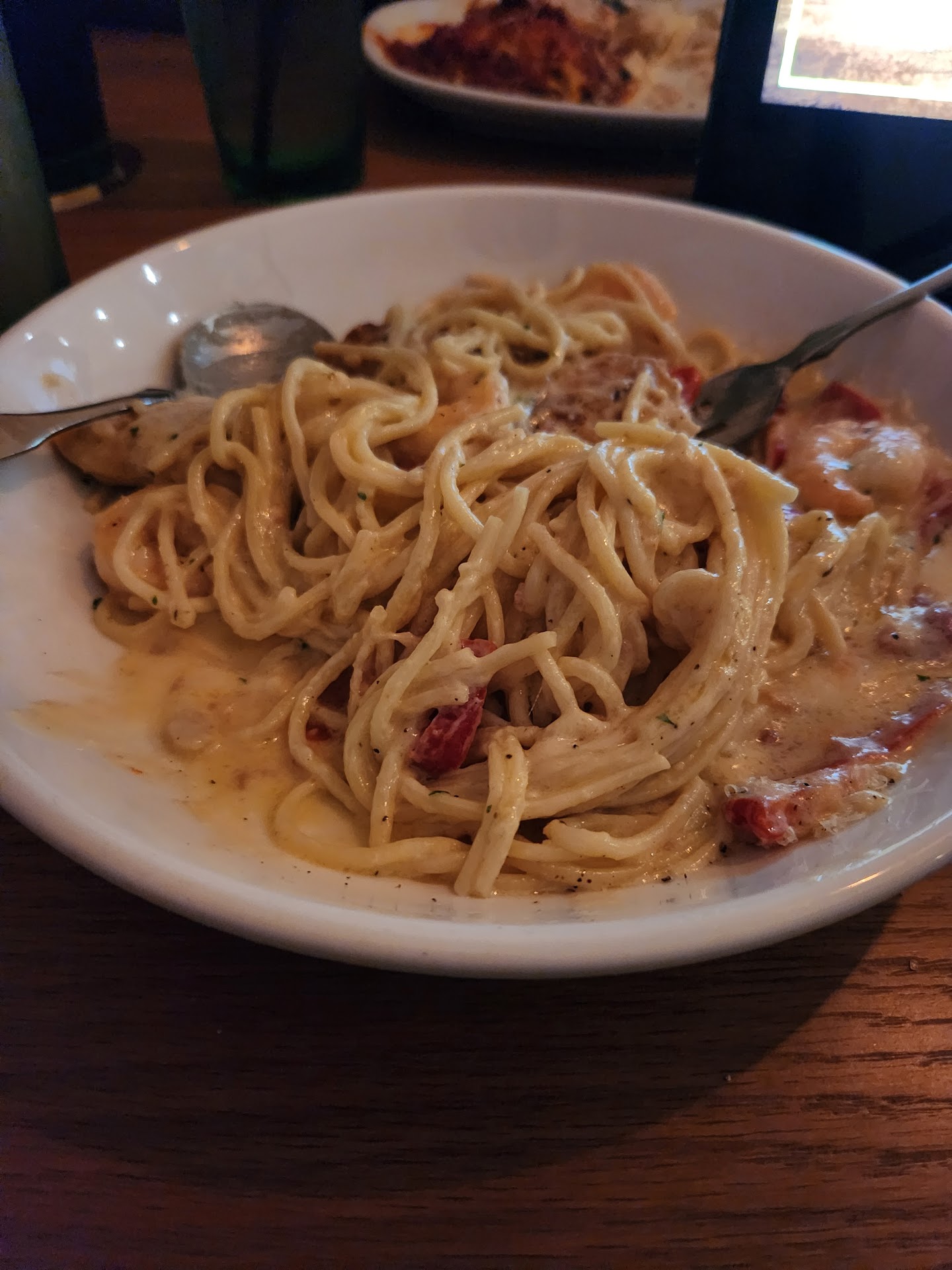 My wife ordered Chicken & Gnocchi soup and Angel Hair pasta with olive oil and shrimp. The soup didn't arrive with my salad as requested. We finally inquired (with another server). About 5 minutes later her appetizer soup arrived with her entree. Her special pasta order was accommodated but needed more olive oil. The shrimp was fine.