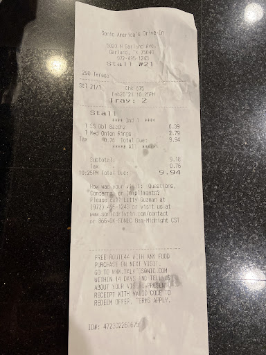 Read moreI visited this location on Friday, waiting 15 minutes no one ever took my order and then the lights were turned off on several customers waiting to place orders. So today, I revisited this location, here now the young lady rings up my order for #2, I bring it to her attn that the price she charged me is not the price shown on the menu. She doesn't apologize for the discrepancy first of all, then she tells me she can't change it and tells me to have a nice day. Disregarded the issue, never said let me notify my mgr, Sonic train these kids how to handle customers issues, don't just pass the buck. I certainly don't have extra money to throw your way. Get it right. I also asked for $1.99 Wacky Pack, she tells me that stopped to days ago. I had to correct her and let her know I just came on yesterday and paid $1.99 for it, she had nothing to say...