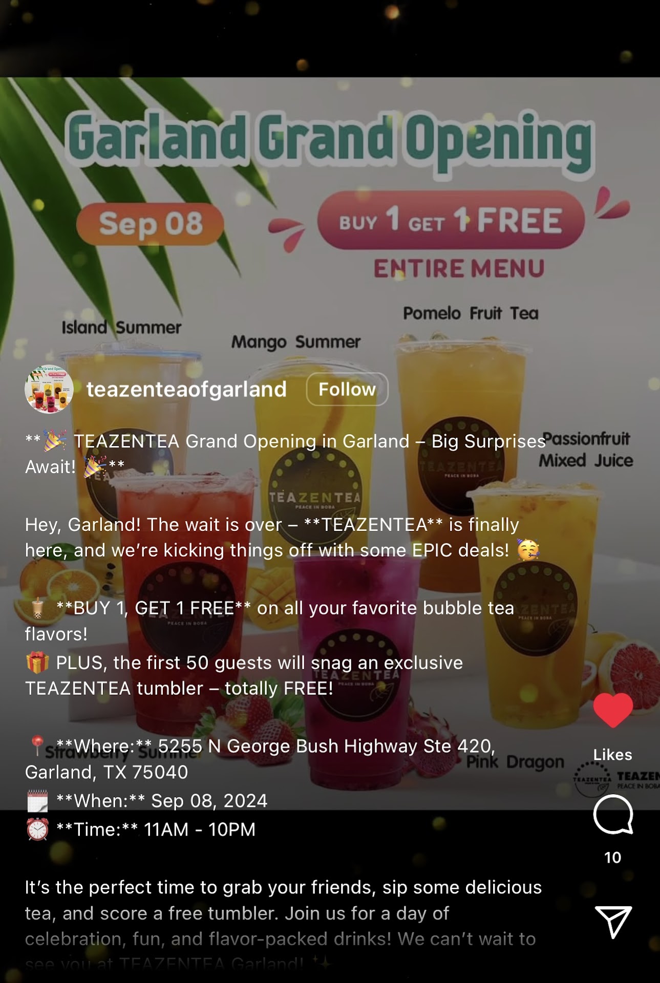 9/8/24 I just experienced the worst experience I've ever had at TeaZenTea today. I'm not sure if they got a new owner, but Mi (her name) was extremely rude to me. I came in because their Instagram post said it was BOGO all day. The post only specified that the first 50 people get the tumbler, but it said ALL DAY for the BOGO event (11AM-10AM). I waited in line, and when it was my turn, I asked if the BOGO was still happening, and she said no that was only the first 50 ppl. Confused by the post, I read it again and it did not state that it was the first 50 (besides for the tumbler). She agreed to let me get my BOGO, but then turned away and made me wait 20 mins before I could order my drink despite being last in line at the time. I was being considerate and said sure, but thinking back, I think she just picked on me for no reason just to get me that "BOGO" special.