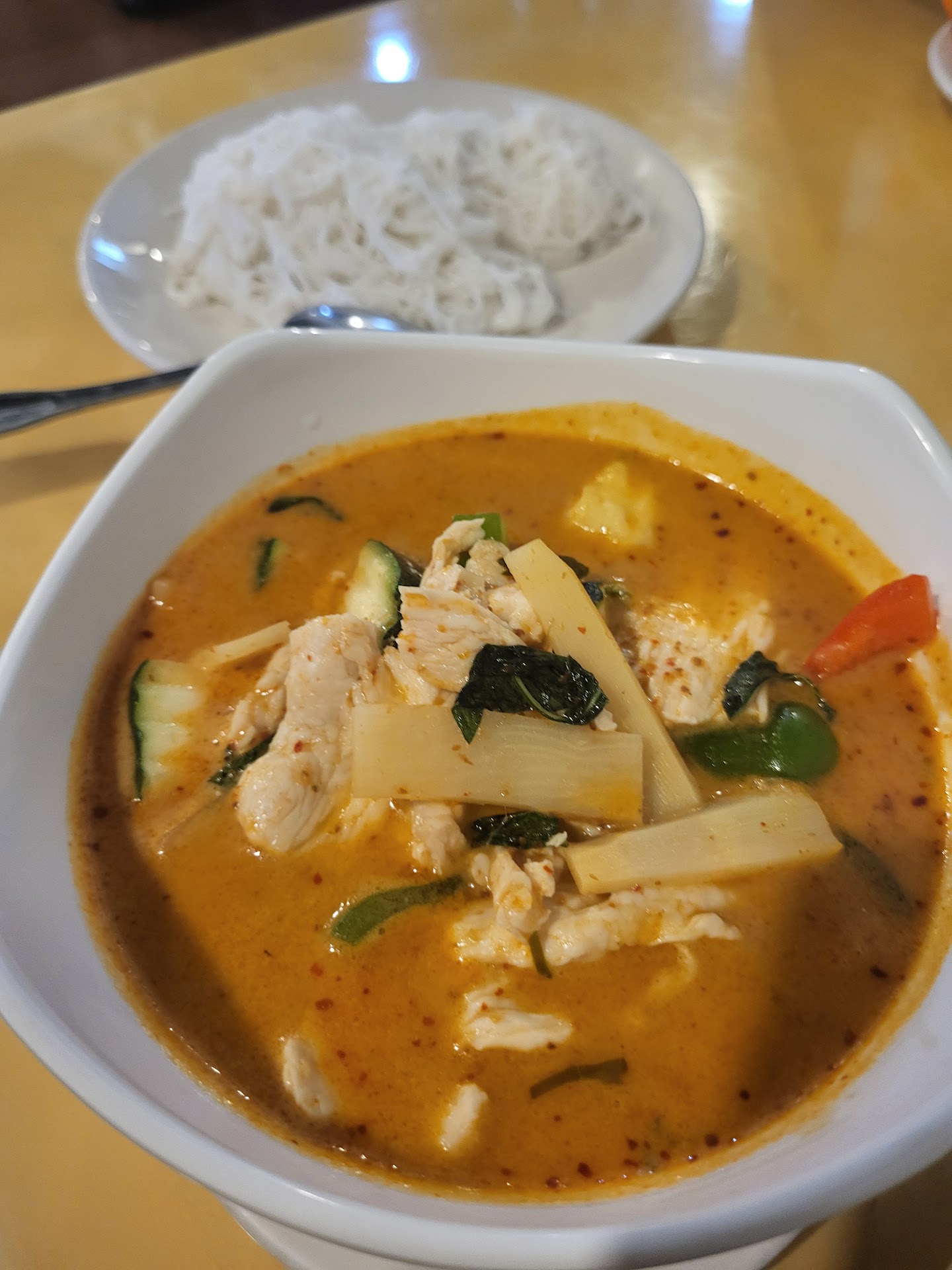Really good Tom Kha Gai, thai tea, Pad Kee Mow, and Pad Thai. Serving sizes are good, staff friendly. Sometimes your requested spice level isn't spot on, but I'm used to level 3-5 with no complaints.
