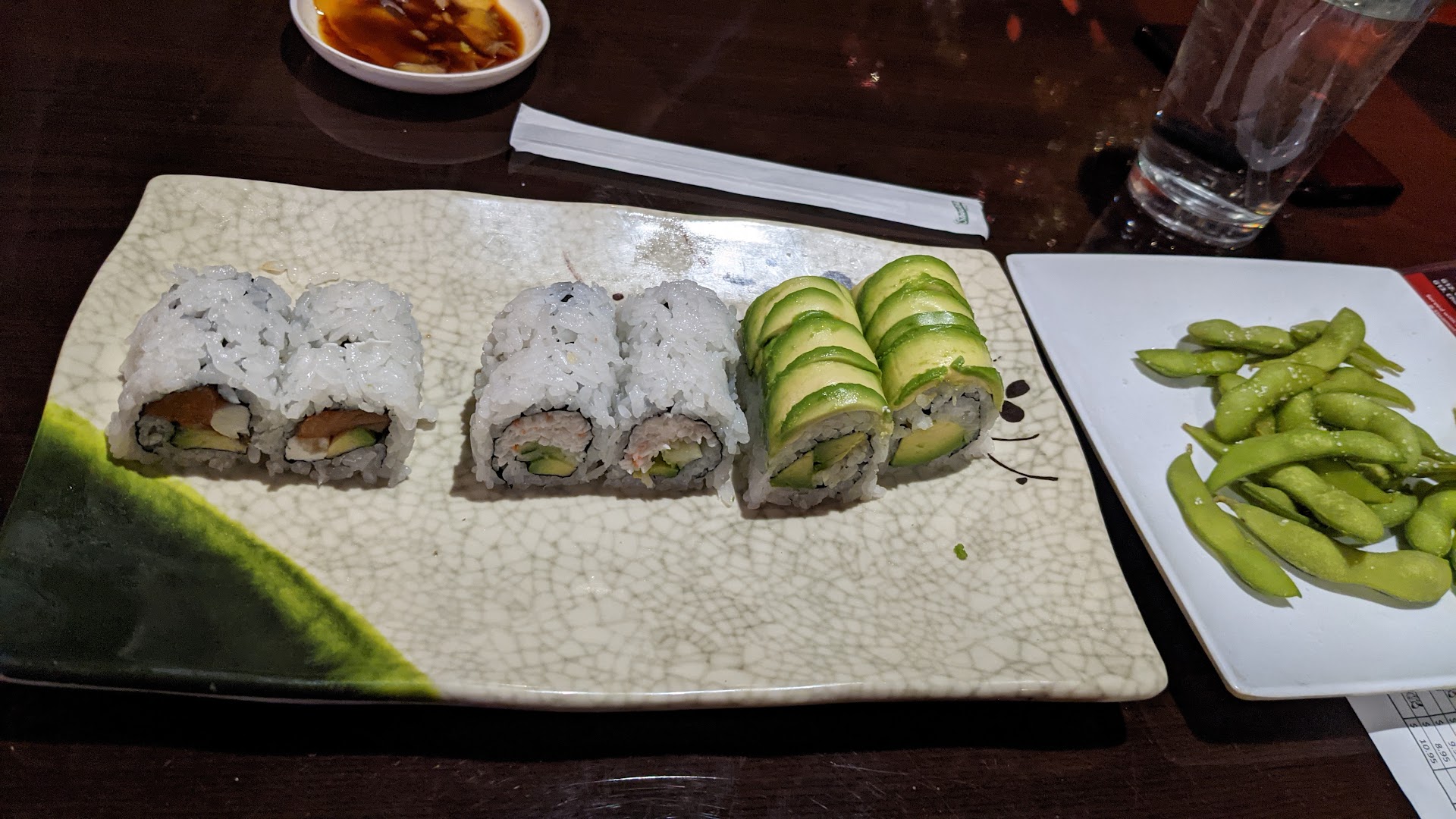 As I was starting to search for reviews on the rolls, I noticed there were no prices on one entire side of the menu. The side without prices is where the custom rolls are listed - and there are dozens of them. Basic rolls on the other side were priced but the good/custom stuff was not. Not one price. And many (maybe most) of those special rolls were listed as "2 pieces" or something along those lines. I've never seen that in a sushi restaurant other than a very special roll that is subject to market pricing.