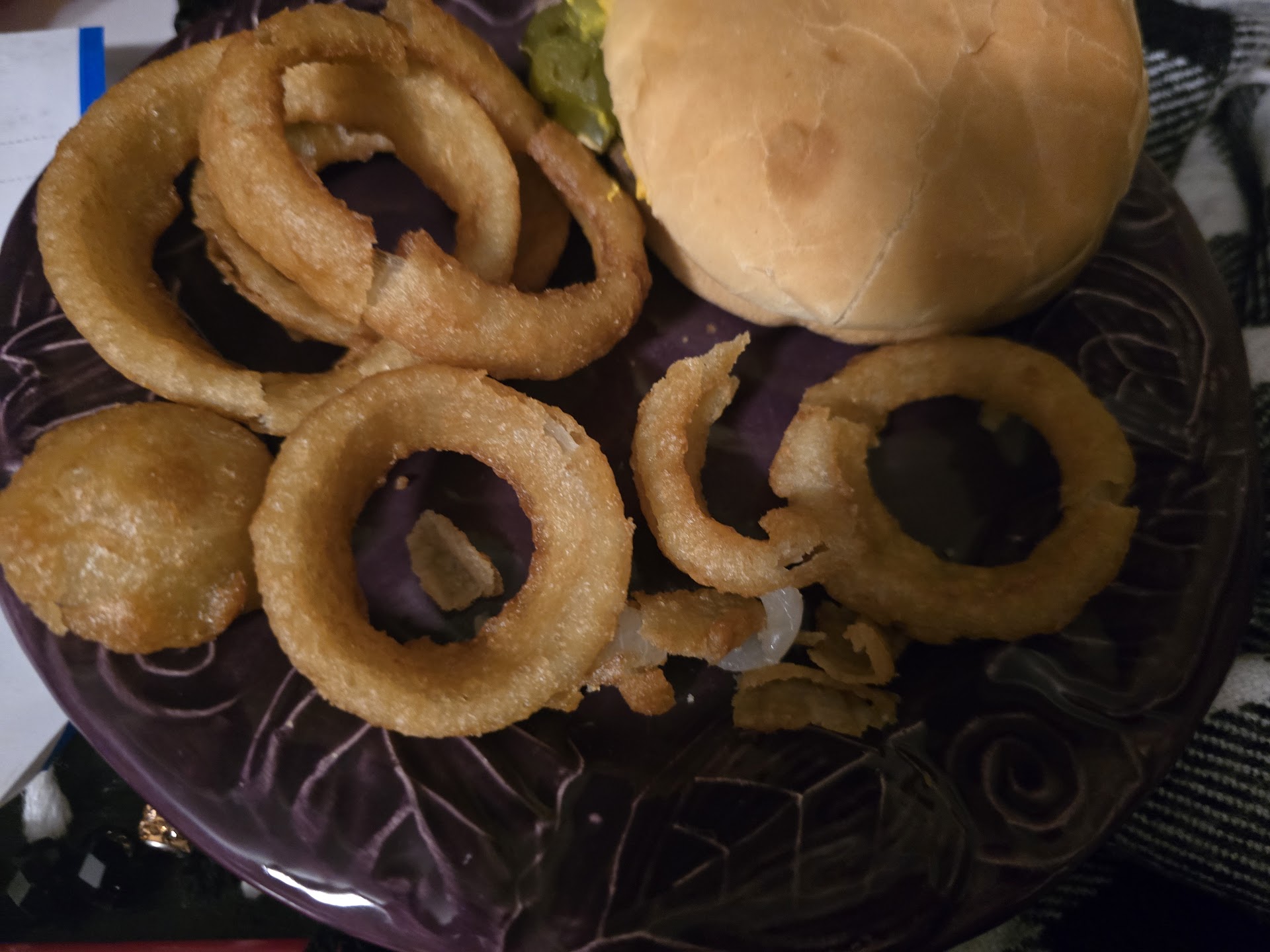 I think I got someone ELSE'S leftover onion rings. Again for $10/bucks I deserve at least half a dozen I can eat. I had not eaten 1 onion ring when I plated the food in the photo. The Onion Rings were nasty AS SEEMINGLY super greasy? MAYBE partially 4? But definitely not good like always. 😕