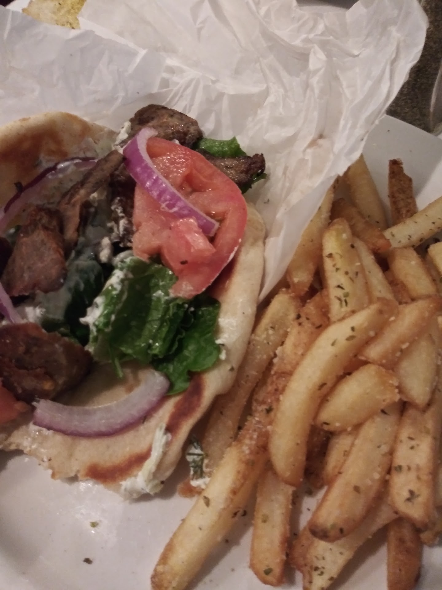 The Cons: Our hummus was bland, lumpy and almost inedible. I am pretty sure we've never had worse hummus out anywhere. The filling in the dolmas was very smooth, like a puree, which was a bit off-putting. The dishes were under-seasoned across the board. We had to liberally salt everything, including the soup that we both really enjoyed. The fries were slightly under-cooked, and while I enjoyed the oregano as a seasoning, they did need a bit more salt, and a nice pop of lemon would have been welcome. The pita that they use is unsalted, so the "wrapping" for sandwiches and the triangles for dipping don't add any extra flavor to the dish. Very bland pita, although it was nice and soft.