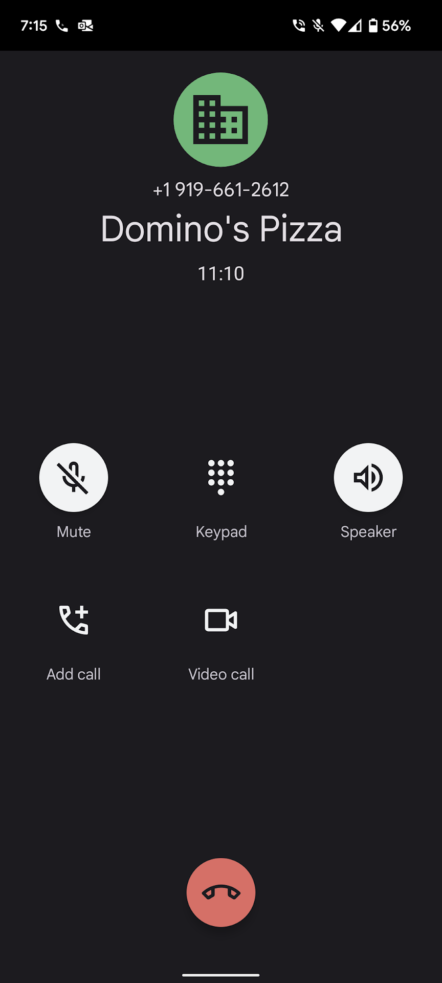 Not complaining about the delivery time (since this was on a Sunday afternoon during the NCAA season). However, my suggestion to you is: ORDER ONLINE ONLY and hopefully you don't have to call in the restaurant! This is too bad, since I do like Dominos and I guess I am stuck with this...