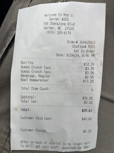 Read moreI hate that I have to leave this review. Moe’s in Garner has fallen off. I used to bring my family here sometimes and always had good experiences. We thoroughly enjoyed the food and the service… until today.