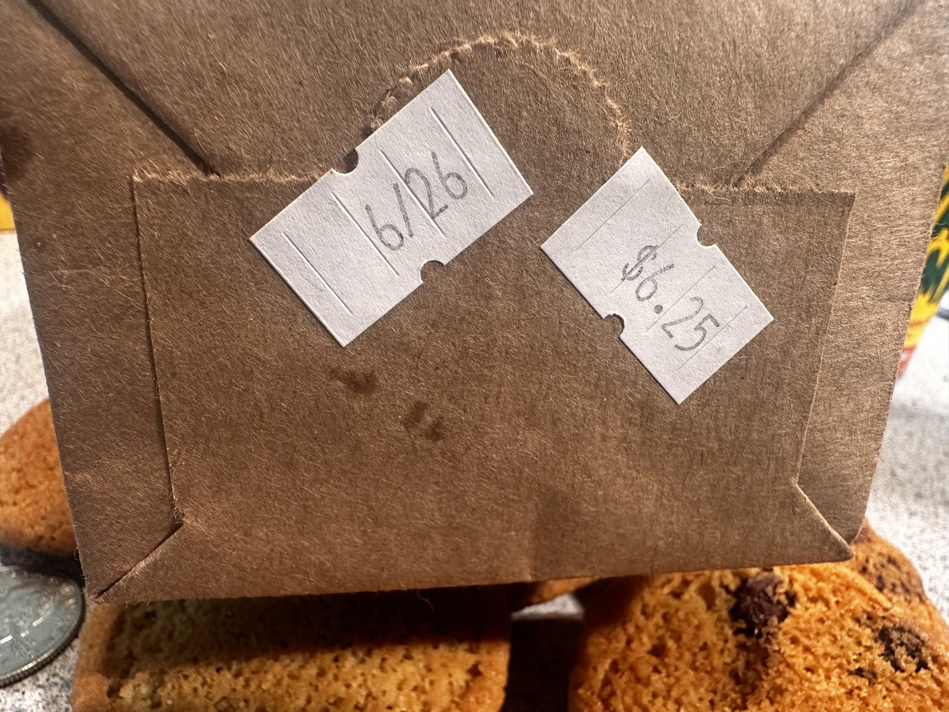 Most recently, I purchased a small bag of small chocolate chip cookies (pictured). For $6.25, I received 10 small cookies, US quarter shown for scale, including several cookies that appear to have A chocolate chip. I guess the label, Chocolate Chip, is literal. @ least 1 has 0 chocolate chips.