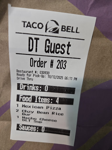 When we got to the window, the person (he/they) didn't say hello, welcome or anything when opening the window, but rather turned back to the other person standing behind them and talking. No words were spoken by the person at the window to us at all while I handed over our credit card or when he/they handed us the bag. I had said hello when the window was opened orignally and a thank you when the bag was handed to us, but the window was just simply closed. There were no sauces in the bag (we weren't asked at all if we wanted any) and there was no receipt (just the tag slapped on the side of the bag - pictured). When we got home, the mexican pizza looked like all of the toppings were on one side, the top 'core' of the tomato was included and the side of the pizza with no toppings was basically just shell. The taco supreme...well, that was about the same, there was one small dollop of beef at the end of the shell tucked into the box/taco holder with the lettuce & cheese being on the other end...nothing in that taco, the way it was filled, was meant to be eaten together like a taco should. I'm not sure what was happening in the food prep area but it seems they had as little interest in prepping the food as the person at the window had in dealing with the public.