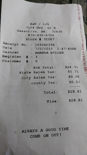 Read moreThis used to be my favorite place to stop when coming thru Gassville. We just stopped to go in the drive-thru, we sat in line about 15 minutes before making it to the window to pay. The receipt shows 1:47 pm, we didn't get all of our food until 2:20. The girl running the window was super unprofessional and quite rude to us from the first words she spoke. The other workers and her didn't seem to be doing anything but standing around talking. Like getting food out was the least of their priority. I warn anyone going there to not go if you want fast food. You'll be there waiting more than 30 mins. Food was meh...a little too greasy but not terrible. It sure wasn't good enough for me to wait...