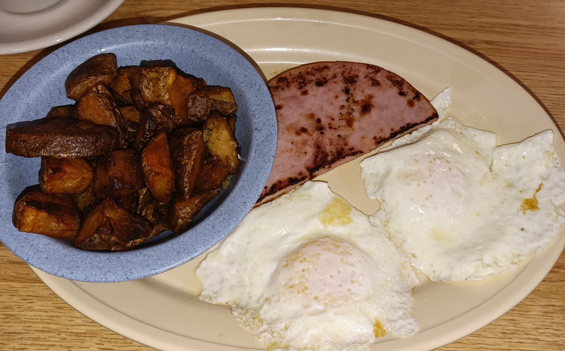 I ordered the city ham with two eggs over hard. As you can see from the pic...it wasn't over hard, not with that much drippy yoke oozing out. (I got grossed out by the ooze)