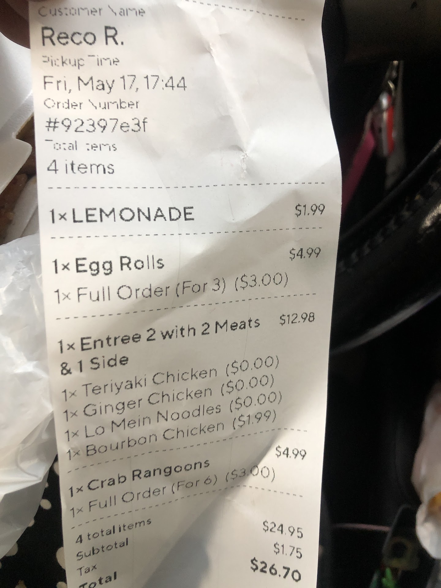Ā Ā Ā Read moreI do not recommend this place to anyone. First they need to get people that want to work and not kids. The cook must have quit, because the food when we tried it the first time it was fresh hot really good we went back a second time ok the two last times was not even edible. The ginger chicken was burnt tough you could bit it , it was so hard this last Monday they got it all wrong went back to tell them and they said we will put it back on the card never did for the chicken that they was supposed to have given us they gave us the nasty yellow tasteless yellow rice. We will never go there again, for the price you pay and expect to get they are a poor excuse of a buiness. I would not recommend this...