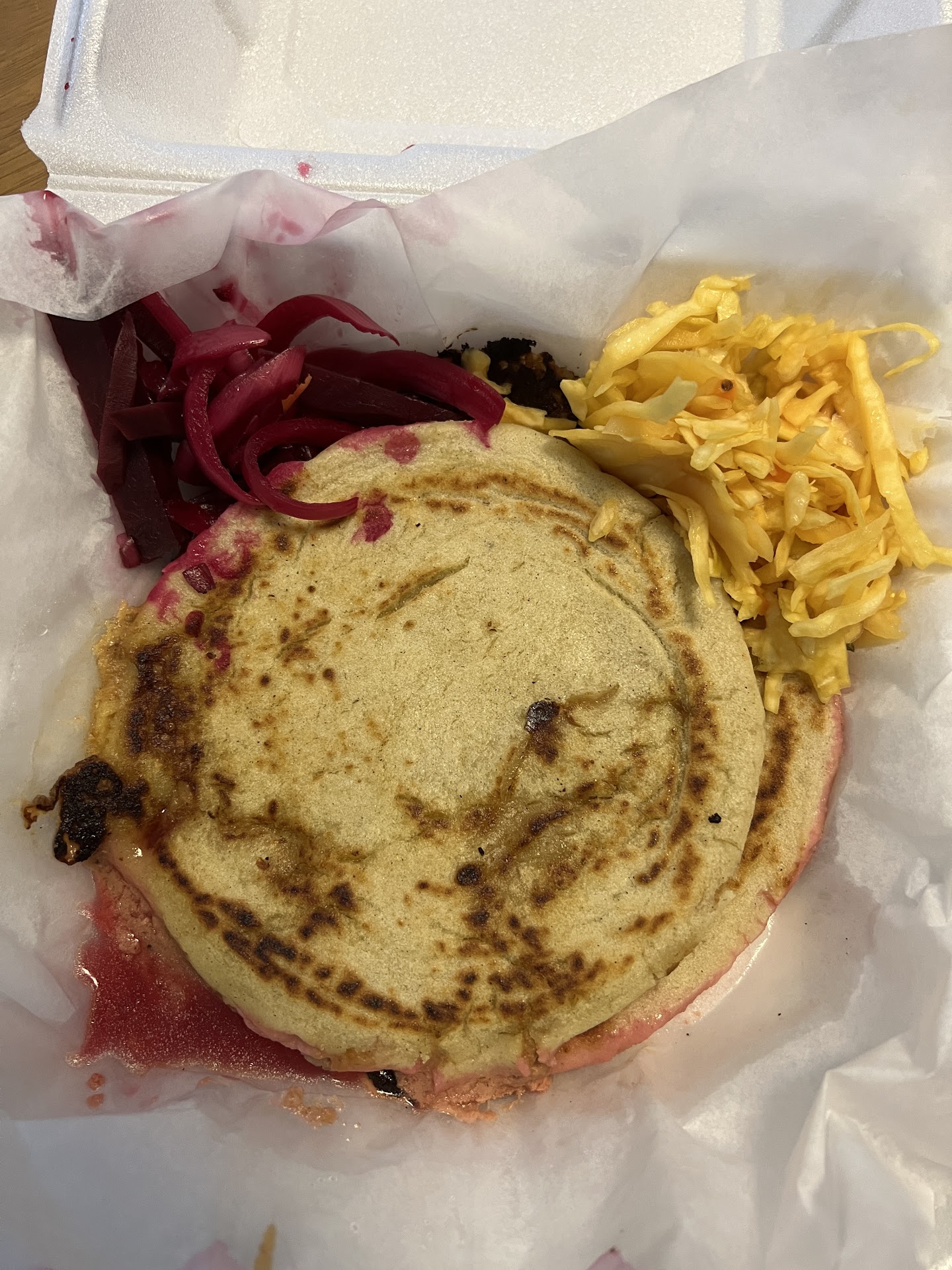 I ordered 2 pupusas, one with pork and one with pork and cheese. Barely any of them had any meat or cheese in it, it was literally dough. I was so disappointed because this isn’t the first time I’ve had pupusas. One of my pupusas was drenched in the red/purple onion and beet sides that they included. I could not even eat that pupusa. There goes my money and half of my lunch.