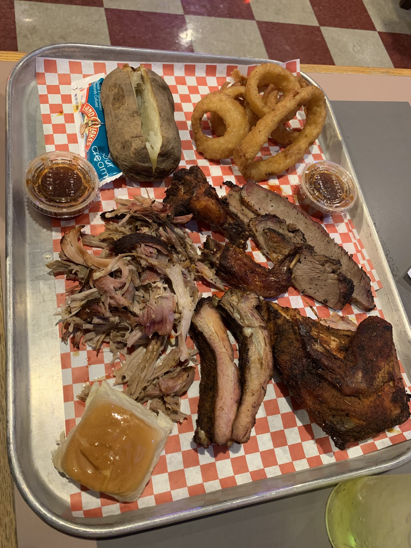 Ok, this actual needs a 0 star... i ordered the combo platter, good price tho. I got the baby back ribs and pulled pork. Ribs supposedly grilled daily, they never saw a grill. Oh and by the way they are spare ribs not baby back. I pointed this out to the waitress and she first argued then when i pointed out the differnce she respondid with, "well the box says babyback ribs".. 🤢 dont get me started on the pulled pork , they have a smoker out front but it's obviously for looks, the pork had no smoke flavor and was dryer then the ribs, which says alot because they were dry. No actual bbq sauce to help with dryness of the pork but a teacup of what tasted like a malt vinegar with dry seasoning mixed in. Which by the way we noticed later the table had malt vinegar bottle on it. Lol... if your looking for good bbq, dont stop at rays. Beer was ice cold tho, literally had ice chunks in my bottle. Love me some cold beer.. decor was cool, but this seams like a bar first, and bbq 4th.. which would explain...
