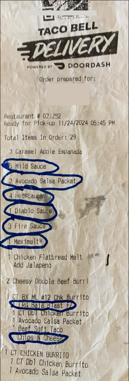 We ordered Taco Bell delivery through the Taco Bell app from the Hudson Blvd location on 11/24/24. The ordered arrived sealed in the bag. We unsealed the bag with excitement. That excitement quickly turned to sadness, as there were multiple items missing.