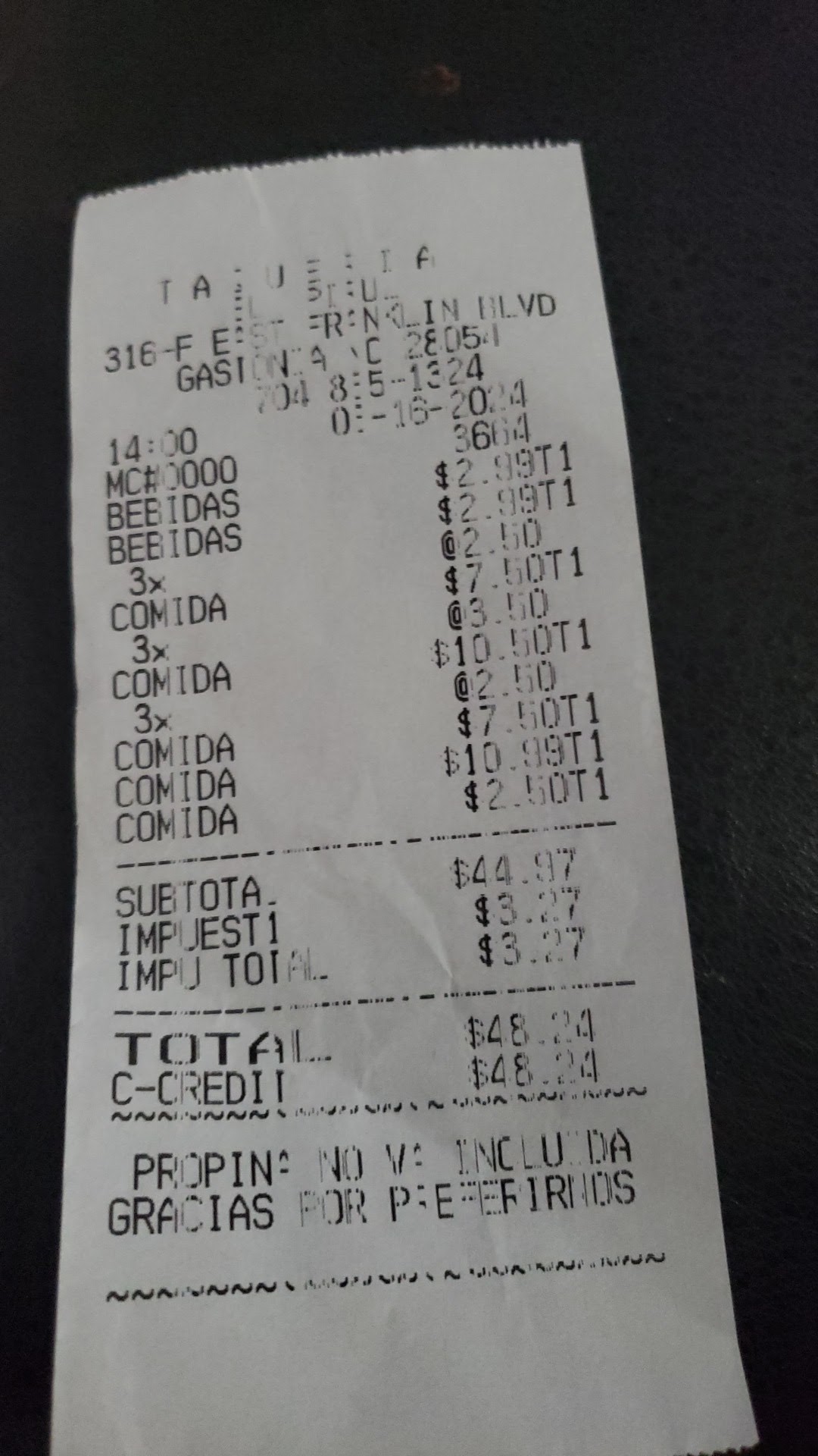 Read moretoday I went with my husband and a friend to go eat lunch and we order all the same thing which was steak tacos simple and easy while waiting for our food we got our drinks and a group of 4 people walked in they got their drinks plus their food before we did and meantime we see a roach crawling on the floor we got up and cancelled our order and left this is just nasty if u can see a roach out on the sitting area imagine in the back and in the kitchen .... just wanted to give everyone FYI...