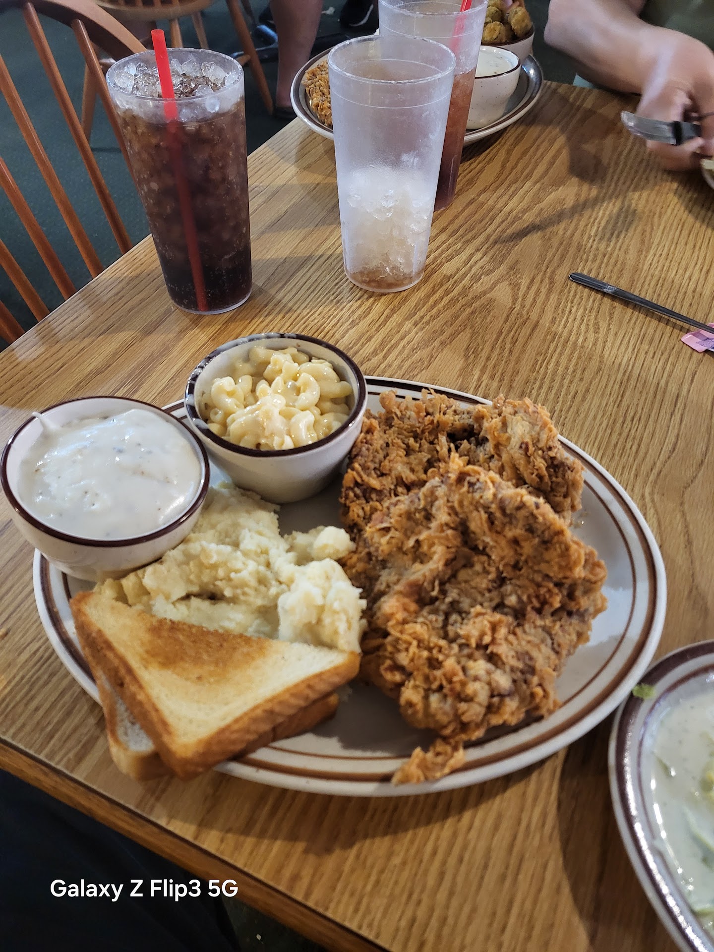 Ā Ā Ā Read moreAtmosphere was ok. At first the guy next to us was loud and boisterous annoying using profanity alot and not caring who he was offending or bothering š. Now ik the staff can't control that so no dings on them. But after that table left everything was awesome. The food was ofnthe best quality as you see we both had chicken fried steak. Those mashed potatoes were so good I didn't even want to soil them with the gravy. The gravy was so good I dipped everything in it because it.seemed a shame to pour it all out on stuff. The chicken fried steaksni had were very large and tasted great. The mac and cheese just needed a lil bit of salt (but ik u can't season like your at home) and it was spot on. And if that wasn't enough you had an unlimited trip to their salad bar which had so much great stuff on it that honestly all that for 21.95 Is way better than any other deal tou will get any where else. My Mother had the small chicken fried steak. So she had the same as I but one of her sides were fried okra. She said best she'd had in a while. Plus the unlimited salad bar for 16.95. Folks your not going to find food this good and for this value any where else. Y'all need to go check these folks out. Run dont walk! Beat me there Dont...