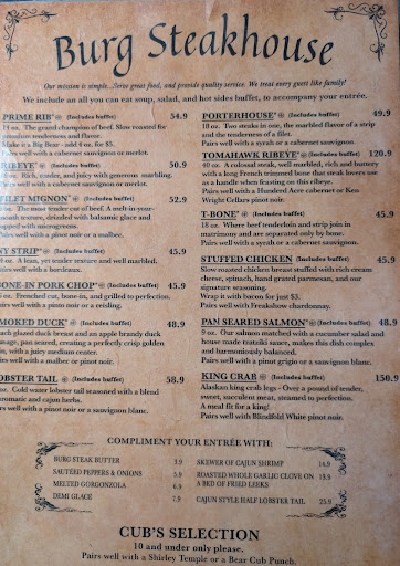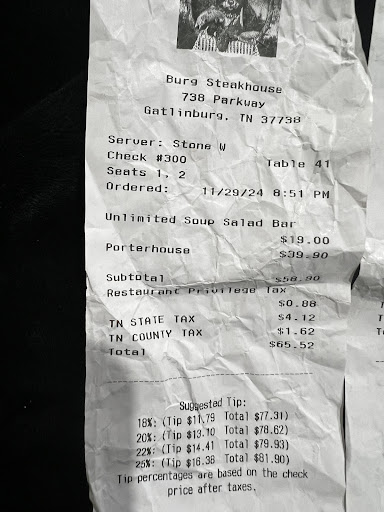 The food was horrible this time.if I could give no stars I would.Our server Stone was amazing!! He was very sweet from the moment we sat down and very apologetic for our experience.The atmosphere was as expected for a holiday weekend however a large family with 2 large baby strollers and children were placed near us made the experience even worst as they were extreme loud in an already loud establishment.This is not the restaurants fault but perhaps they should have been seated in an area more off to the side to blood bumping the other patrons. We ordered the porterhouse,the ribeye and the salmon. My son ate the porterhouse (requested at med well but it was well done) . My dinner date ordered a prime rib at med well.It came tough,dry, and well done.The server offered a steak at med well.It came out overdone and well. My Salmon was ordered at med well .It came out crispy on the edges,burned underneath,dry and extremely salty.Inedible described our meals. We expressed our disappointment in the meals.We did not eat them.The server was extremely apologetic.Our checks arrived with 19.99 buffet charges.I asked for a manager .The lady manager arrived and explained that that was the charge of the buffet when you donât purchase an entree.Maâam our entreeâs were burnt. As a previous restaurant manager of restaurants from cafeâs to fine dining steak houses, this was a problem.The manager never applogized for our experience.I asked her would she be able to remove th cost all together or at least just charge the add on cost of 11.99 considering we didnât even eat much as our entrees were not edible (which was their fault) and it would have been the courteous thing to remove the fee all together. The manager said ok and brought the checks back including the 11.99 charge.Very petty for a manager as she will loose even more for your business handling guests in this manner.We paid our check as I wasnât going to go back in forth with her.I came with an organization of about 180 ppl who visit Gatlinburg yearly at the same time and need to dine for the week.I bragged on Burgs at one time now I have shared this disappointing experience with them all and we will not be returning next Thanksgiving.I attached my receipt to show how she adjusted the check from $19.99 to the add on fee to ensure that I paid âsomethingâ for what was one of the most disappointing meals Iâve ever had in life and I eat a many places.Shout out to Cheasapeakes down the strip who has amazing seafood.I will double up on my reservations there next yearâŚme and our crew of 180 ppl.The manager could have at least salvaged the experience for her server but she did not care.We still tipped the server as he understood and...