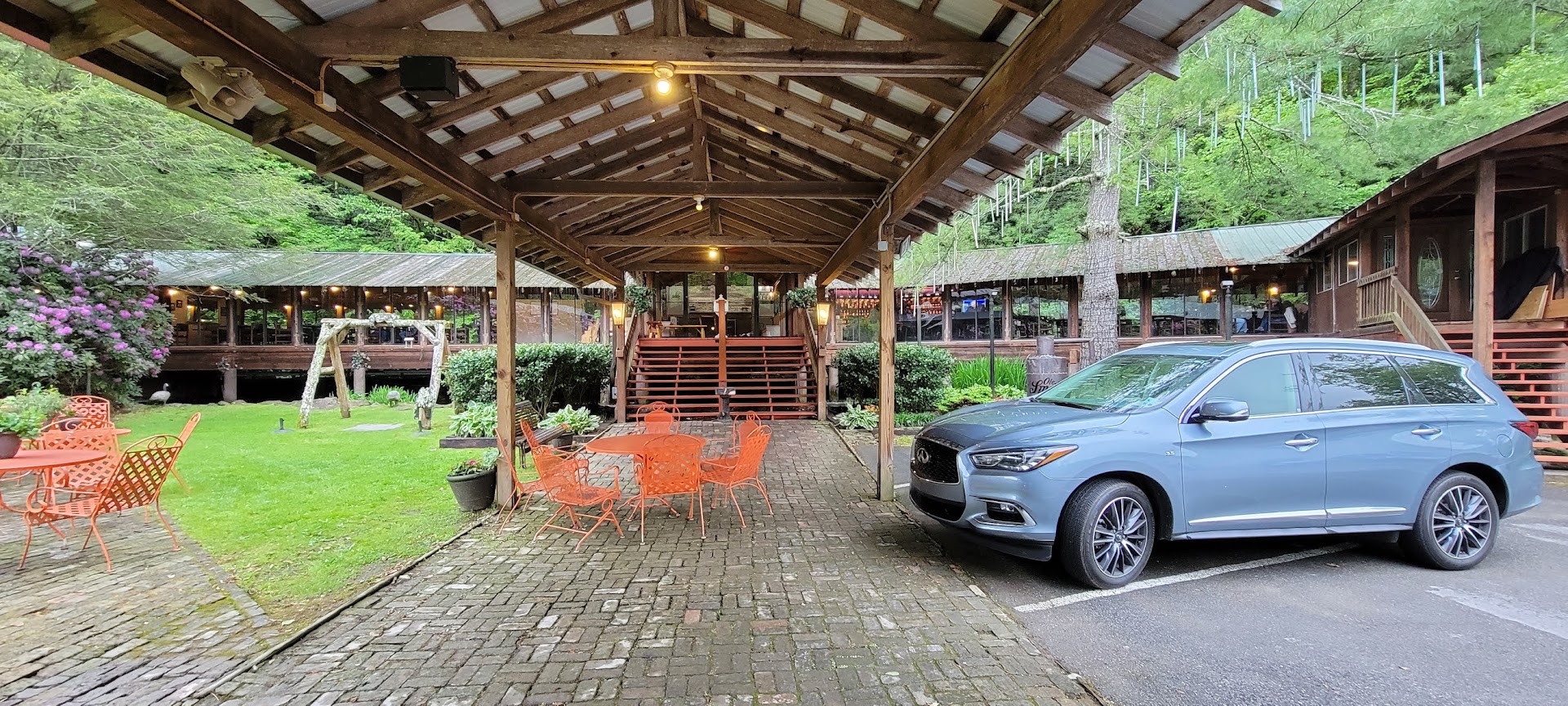 Me and my wife were out here on our honey moon and found this spot one evening. Our server was Josh and it was a little later in the evening. From the time I pulled up, we fell in love with the place. It was set back off the road, and sets over a pond which they pump the water up onto the roof and it trickles down the roof back into the pond but it gives it quite the nice effect. We were lucky enough to get sat up against the windows so that was our view from the inside as well, which couldnāt have been better to us. There is a lower parking lot for those who are older/handicapped that donāt want to park in the upper lot and walk down. Definitely plenty of free parking.