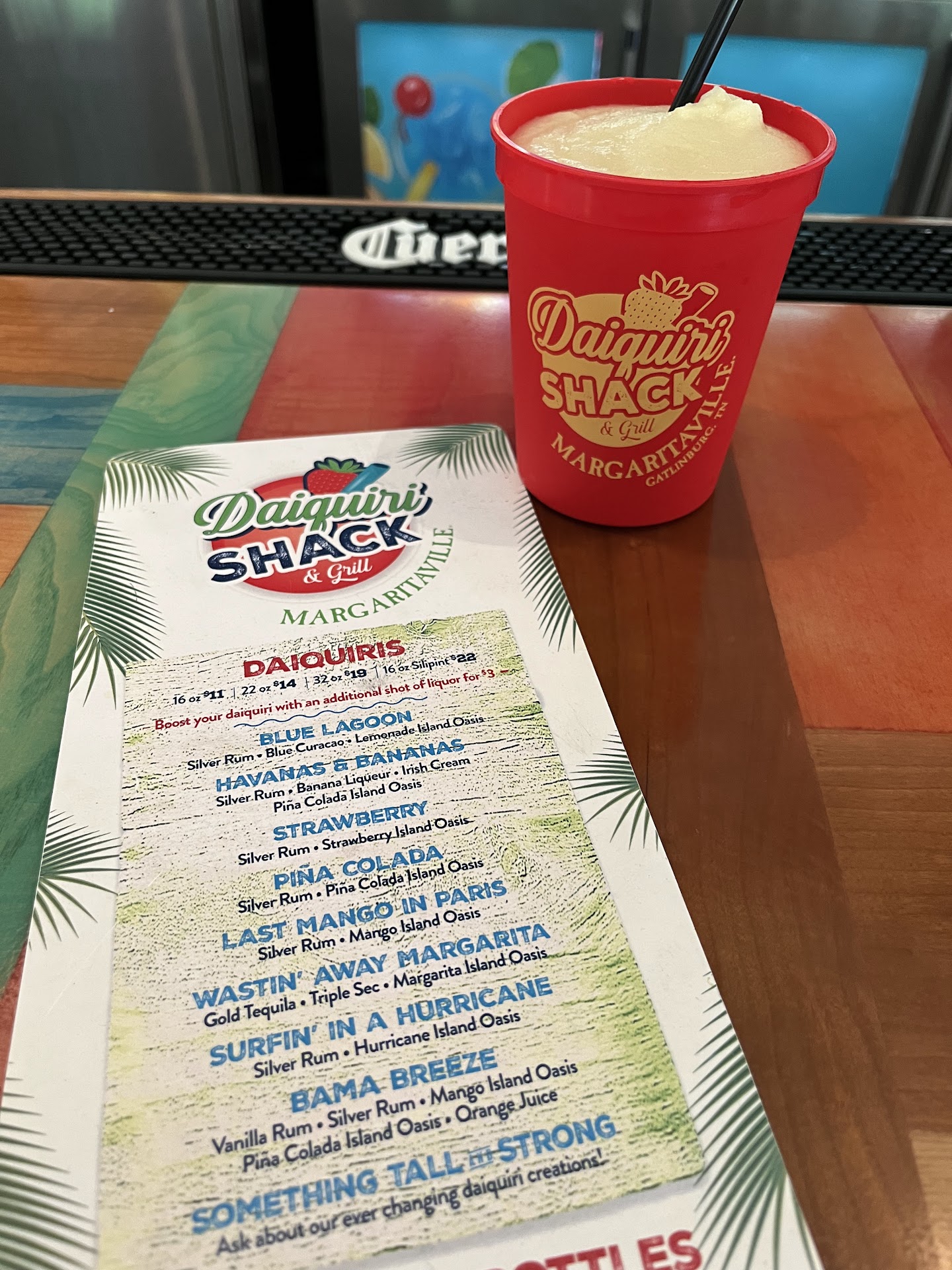 Ā Ā Ā Read moreWe went twice during our stay in GATLINBURG. This 4-5 star review is based on our experience the first time, not the second time. The first time we had a great bartender wait on us (morning of 5/30) he allowed us each to sample one drink before ordering and we all ordered those exact daiquiris. He told us about saving the cup to bring it back for a discount next time and after some coaxing by him, we agreed and took them with us. Great experience! We carried them around the rest of that day and then all day the following day bc we were going to Anakeesta anyway and could pop by afterwards for our discounted drink! Yay! The second time was just a āfineā experience, just kinda blah. We got our refills in our red cups but the new bartender said he was not allowed to let us sample any daiquiris so we all just got the same thing we had the day before which was disappointing bc we all anticipated being able to get a different daiquiri that second time. The drink was great - the second day service was just blah, we felt pretty ignored other than the initial contact to get the drink refilled and then paying the bill. LOVED day 1 experience,...
