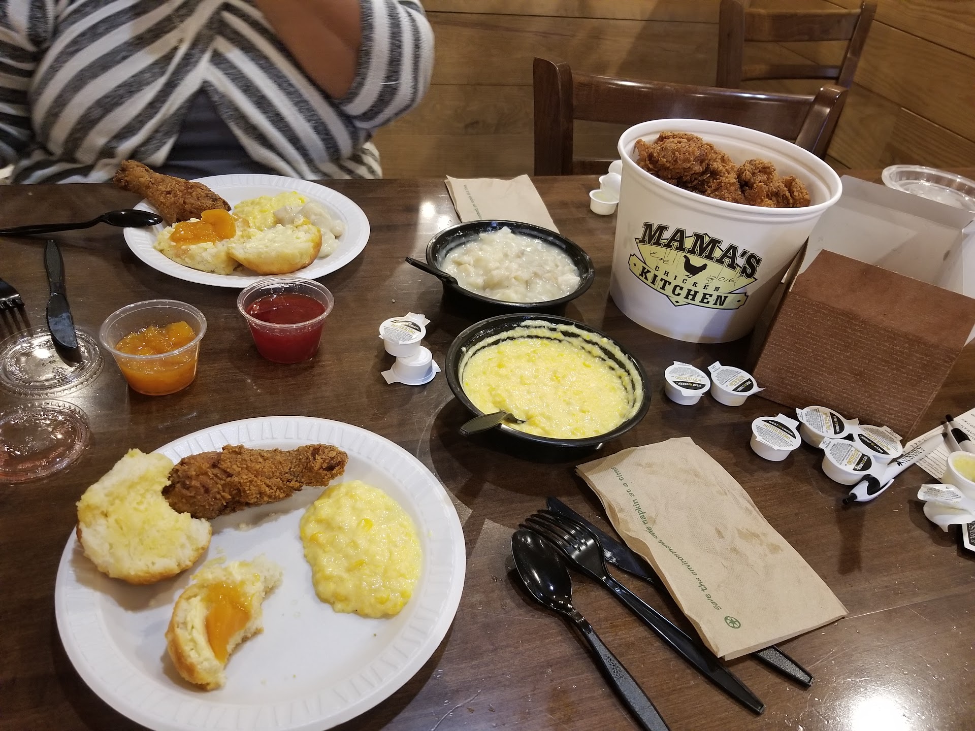 Read moreThis place is amazing!!! My wife and I was looking on google for restaurants in the area that was on the reasonable price side and we wanted to check out Mama's farmhouse but did quite want the all you can eat at the time so we checked this place out instead. Once we got there we realized that it was owned by the same people that also have the farmhouse and the Alamo, which is also an amazing steakhouse! We ordered the 8pc with sides, chicken n dumplings and cream corn. The 8pc also came with 6 extremely large biscuits that were very good. The chicken season was amazing but those chicken n dumplings were off the charts!!! Even the tea was awesome and actually tasted like tea instead of water. It was a meal that we could not finish so you definitely get a great portion. The service was GREAT and the young lady that took our order was very nice as well as the other staff. They all were smiling and talking attentively and happy to be there. The restaurant was very clean as was the bathrooms. We eat at Huck Finns all the time but we both agree that Mama's Chicken tast better!!! Definitely will be...