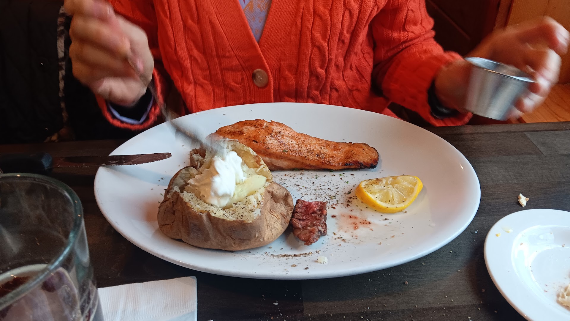 Once at the table, our server was the bright spot of the evening, polite, attentive, and patient. My wife and I both ordered ribeye steaks, which were cut tableside before being grilled, while my mother ordered a petite filet that was not cut in front of us. The salad bar was basic but clean. When our entrées arrived, the steaks were cooked correctly, though the baked potatoes were small and came only with sour cream unless we specifically requested butter or went to the salad bar for cheese. The ribeye steaks were served on very large plates that made the steak and potato look small, leaving the overall presentation feeling incomplete. Adding an additional side or garnish could easily help balance the plate and improve the experience.