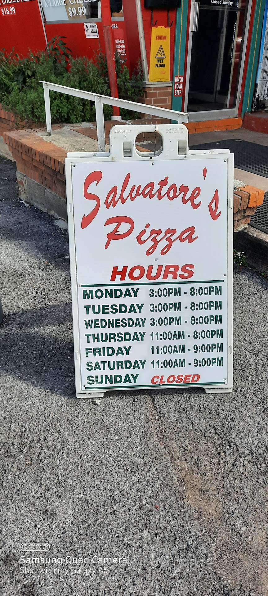 Read moreI was so hungry and in a hurry, I drove passed Salvatore's Pizza, and observed 4 people eating pizza at a picnic table. I stopped and asked if they sell pizza by the slice and they said yes and told me they all ordered 2 slices of pizza with soda for like $3.50 (I believe the price is correct). Anyway I quickly pulled in and asked for the 2 slices that appeared to have extra sauce on them. The lady asked if I wanted extra sauce and I excitedly stated Yes! Omg the pizza had a soft, yet very crispy bottom (which is a must for me) and the best sauce I have ever had on a pizza! This was my first time here and am going back today! The slices are HUGE! The prices for whole pizzas are cheap! I am posting their hours so you can arrange to go there! I promise, you will not be disappointed! I ate my pizza so fast, I almost made myself sick (Hahaha). I just couldn't help myself the pizza what that good! I thought to myself how did I miss this treasure? Well, I will never miss a time going there! I recommend Salvatore's Pizza to everyone, you will NOT be...