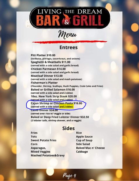 We will not be ordering from Tulunes Living The Dream Bar & Grill any more in the future. My fiance called to order us the cajun shrimp entrees which the picture of the entree menu on facebook from both the 12/8 and 12/30/20 posts by Tulunes clearly show that it comes with a side salad and 2 additional sides. The girl who was taking the order said it doesn't come with any additional sides. My fiance then explained to her that their entree menu on their facebook page from both these dates advertise that it includes a salad and 2 additional sides. She was supposed to check facebook and then after a few minutes she came back on the phone and simply said "no there are no sides" to my fiance. At that point my fiance told her to forget about it and hung up. I then proceed to call back to speak with a manager myself and explained the situation and instead of getting an apology and acknowledgment that their menu does indeed advertise it as coming with 2 additional sides, the manager started to become very defensive and argumentative with me. He gave me the excuse that "nowhere in the history of restaurants do pasta dishes ever come with additional sides"..uhh hello that is what your menu from your facebook posts on 12/8 and 12/30/20 says!! He also proceeded to make excuses about the menu and that someone else makes their menu etc.. at no point did the manager ever apologize and acknowledge that their menu had a mistake and that he was sorry for the false advertisement. I would have gladly still placed an order with them had the manager been more courteous and apoligize to me instead of making excuses and being defensive and argumentative. Needless to say, because of this poor experience with the manager, Tulunes will not be getting another dime of my money in the future. This will be a loss for them because my fiance and I spend a considerable amount of money ordering from their restaurant. Their food is always very good, however, the customer experience is equally important as the food. Having been a retail manager myself in the past, I am going to offer this manager some constructive criticism when interacting with customers: 1. Take ownership of mistakes whether that be yours personally or the ones of the company you are representing 2. Be empathetic, courteous and apologize, but even more so if the mistake lies on your end 3. Do something to turn the negative experience into a positive experience. Even if the customer was disappointed in what you have to say, they will always remember you for how you handled that particular situation and that will likely determine whether or not they will continue to be a customer of yours in the future. I hope the owners of Tulune's takes the time to read this post and that they fix their entree menu from their 12/8 and 12/30 posts on facebook so that they don't continue to falsely advertise and mislead...