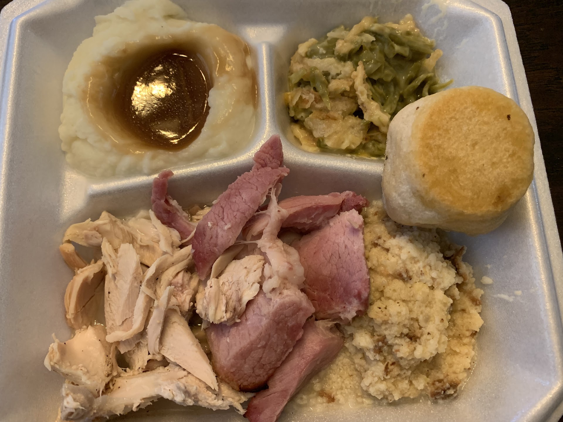 While I applaud this restaurant for being open from 11 AM to 2 PM on Thanksgiving, I am overall very disappointed in the quality of food. To give you some insight, my fiancĂ© and I had plans on traveling back home to Georgia for the holiday to be with our families, but due to unforeseen events, our plans shifted. Upset and stressed, we soon gained some relief once we saw we could get a âniceâ Thanksgiving meal from a restaurant thatâs open in the area. The advertisement we saw said that plates were $13 with a dessert and a drink. This seemed super reasonable. My fiancĂ© went in at 11:30 AM and ordered (2) to-go plates. He asked for sweet tea and was advised they were out. Okay, no problem. No big deal. He just got the (2) to-go plates and a single dessert and came home. Although he didnât get any drinks and only got one dessert, the $13 per meal was still applied, and while I think a few bucks could have been knocked off since he didnât get everything the $13 originally entailed, he still paid the full amount and did not make a fuss. He drove 5 minutes to the house, and I was shocked at what I saw when opening the box. All of the sides were super soggy (minus the mashed potatoes and gravy). The chicken and dumplings were NOT chicken and dumplings. Iâm sorry, but they were horrendous. The pumpkin pie was cold and seemed undercooked. The crust was broken upon arrival and when I picked it up to further inspect it, the crust just crumbled so effortlessly into pieces. It, too, seemed a little soggy. I worked in the restaurant industry for years and always have high expectations when trying somewhere new, but the food I received today was disappointing. We ended up throwing everything in the trash. I hate to make this review, but this was my experience, and I felt led to share. My fiancĂ© did say the staff was friendly, so thatâs...