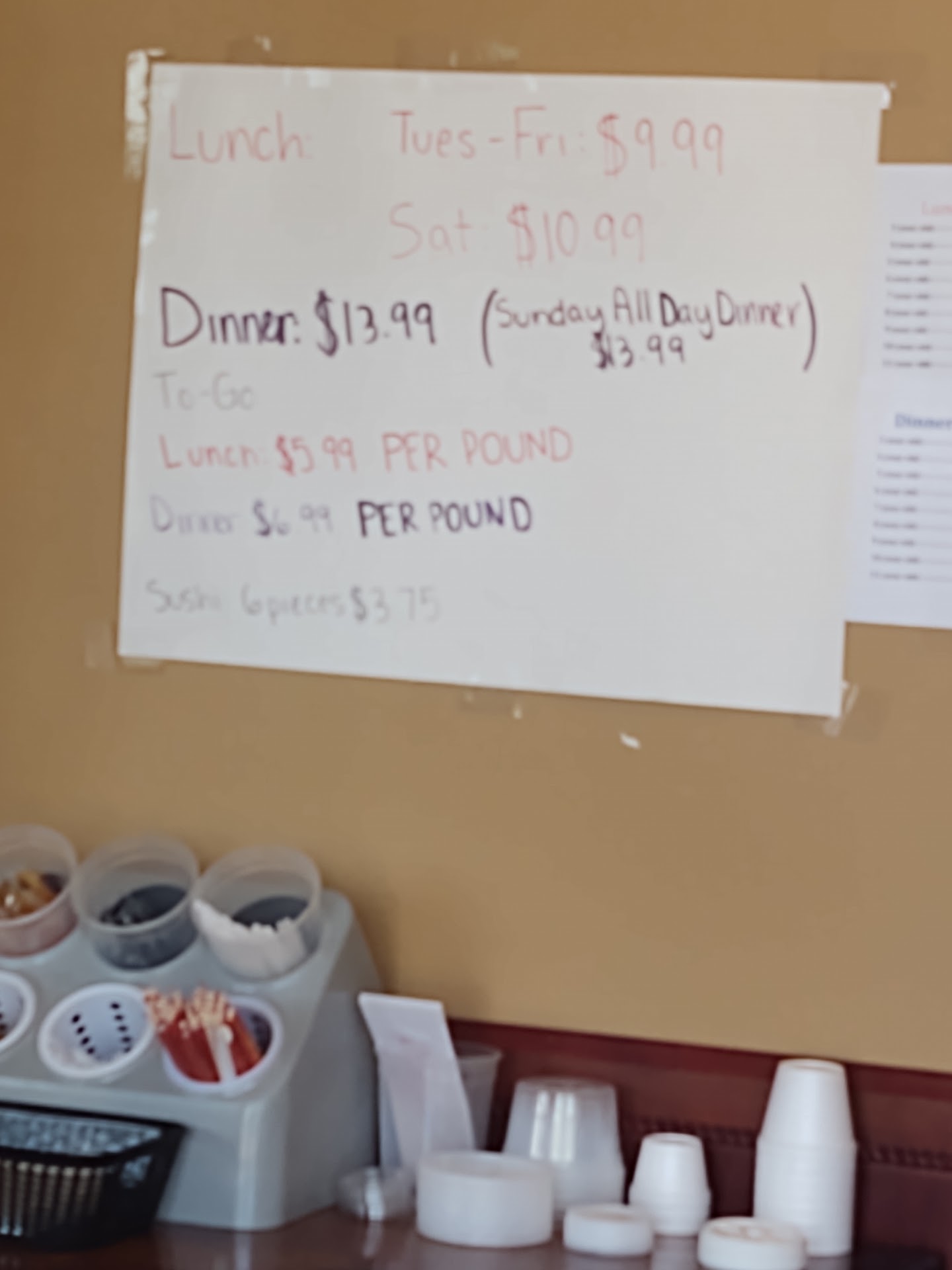 Read moreI used to love this place when it was at the other location by Dunhams, there were more food selections and it was overall better. I have tried to give this place a chance multiple times since they moved locations and the only thing better is… Nothing. The food is always cold and there is not nearly as much food as they used to serve. The young teen with brown hair wearing glasses cashed us out and was extremely rude, literally rolled her eyes at me and sounded like she hates her job. I try so hard to like this place and every time I go i end up eating cold food and only end up being able to eat half a plate.i like the owners, the lady has always been nice to be and so has the Man. The sushi is okay, the jello and little cakes are pretty good, but other than that it’s just meh. If you want to test your luck go ahead, you might get some warm food you might not, you might get food poisoning, you might not. I think I’m done giving this place a chance for now, at least until they figure out how to keep food at a safe temperature, because I’m telling you right now, the food they are serving is not safe...