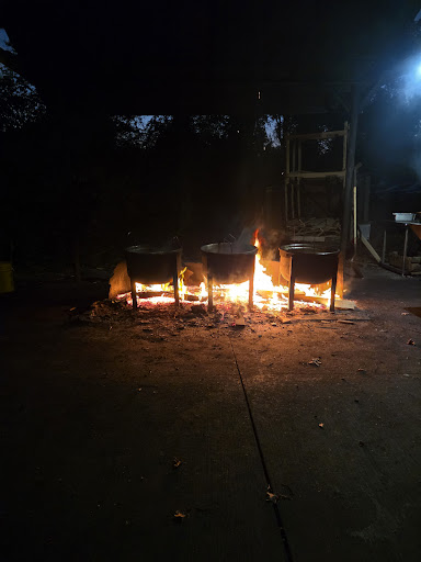 They cook the food outside in a pavilion with a couple of grills, three "cauldrons" and a trailer full of wood. I asked and they said they cook there all year round.
