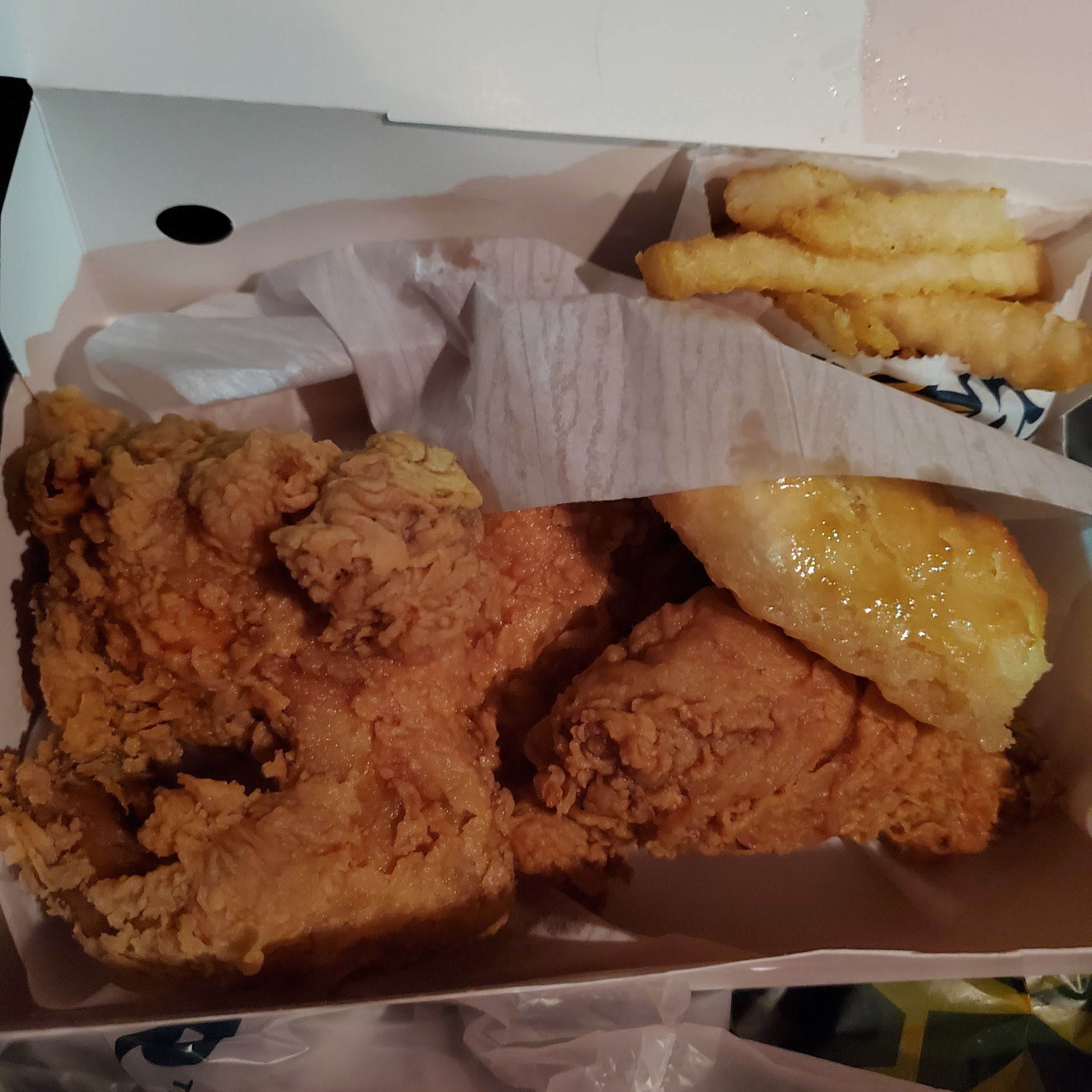 I ended up ordering a 3 piece with mashed potatoes and an order of 3 honey butter biscuits. Should've known it wouldn't be fresh.