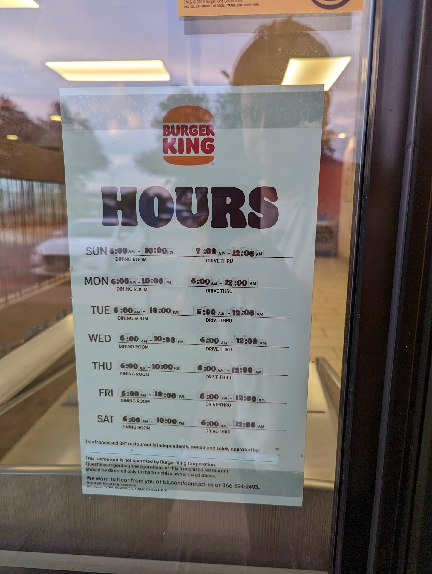 After attending BIBLE STUDY on 9-2-2020 WEDNESDAY night, my family & I decided that we'd eat at OUR FAVORITE SPOT "BURGER KING!!" at 8:45pm I called our SPECIAL SPOT the BK in georgetown tx ((my kids & I visit here at least once or twice a week)) I asked if their lobby was opened still? I was told "WE'VE ALREADY CLEANED OUR LOBBY"... "Ooooh okay", I said & SO I ASKED again!! "Well, WHAT TIME DOES THE LOBBY CLOSE?" HE SAID "WELL IT DEPENDS ON IF OUR LOBBY IS BUSY OR HOW DIRTY IT IS" THEN I SAID "WHAT TIME DO YOU GUYS CLOSE?" HE SAID "11PM" LOL 😆 THEN I ASKED AGAIN "Well WHAT TIME DOES THE LOBBY CLOSE?" HE SAID "AT 10PM" LOL 😆 I said ok thank you!!