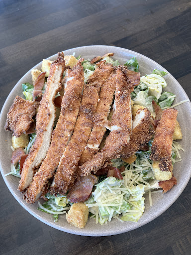 so ever since i saw them post a photo on their facebook page of a caesar salad with fried chicken and bacon, i’ve been meaning to try it. finally got around to it yesterday, and did not regret it. this is a step up from a caesar salad you’d get at most sub/pizza shops, and even a lot of sit down spots. for one, the dressing is clearly homemade. homemade caesar dressing anywhere is a rarity. they usually all have a similar processed taste, but you can tell when you get the real thing…this was the real deal, and delicious. the croutons also had to have been homemade. the chicken was great. crispy on the outside, tender and inside, flavorful breading. bacon was crispy and tasty. it’s a great add on as the bacon mixes well with the creamy dressing. comes with the perfect amount of parmesan cheese. the lettuce itself was a healthy green color and crispy. the bowl was large, it’s a big salad and i felt like i got my moneys worth. i asked for a side of tomatoes, and they gave me what must’ve been the equivalent of a whole tomato, 6 or 7 very thick slices, so that was awesome(the most tomato’s i’ve ever received as a side and i’ve made the same strange request at at least 100 places). the one thing i will say is that while the dressing is fantastic, they do put a lot of it on, so unless you like a lot, i recommend saying light on the dressing or getting it on the side. overall, it was a great salad. the workers are friendly, and the vibe is interesting. it’s as classy as it is kid friendly, and as kid friendly as it is classy. i recommend checking it out if you...