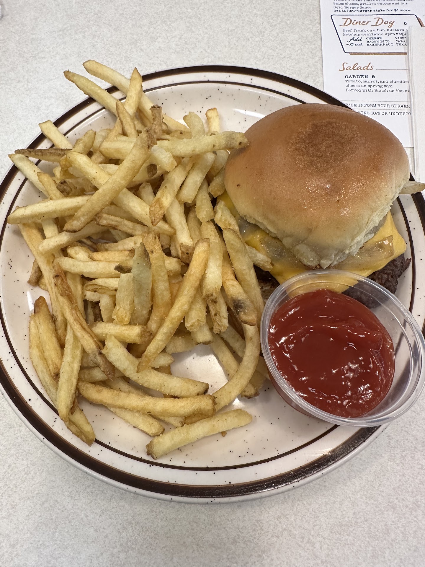Noticed they serve breakfast - so will come back and try that. The “retro” burger spot has a cute diner type vibe … the menu was good. I enjoyed my patty melt burger - the plate of fries were perfect (hot and crispy). Got the patti melt and gold star burger. I liked the smash patti option (highly recommend and would get again) and seemed better than the single patti (hubby got) (it was more med rare cooked)