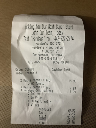 Read moreI would give this location ZERO stars if it was allowed. I placed an order on 12/26/24 via the mobile app. I arrived for pick up around 8:30 pm and it was CLOSED. No one at the drive thru and the doors were locked. I contacted the restaurant this morning and spoke with an employee who stated the manager had a death in the family the same evening. Kathy (so called GM) stated she needed to know what I ordered so I said I would come into the restaurant. I arrived approximately 20 minutes later. The young man at the register told Kathy of my arrival. She stated "I'm busy with customers right now. I don't have time." I said, "as if I'm not a customer that placed an order and received no food" She continued to rant with attitude and unprofessionalim that I've never experienced in my life. She even says "it's lunch time " The total of my order was $94...yes, you read that correctly. I spent $94 for food that I never received because they were CLOSED. I sincerely hope that Kathy has the day she deserves because it's customers like me who keep her paycheck going. Also, I was told to dispute the charge with my bank. Hardee's in Georgetown, SC will NEVER have to worry about my business. I will be filing a formal complaint as I was not provided the chain of command information that I requested. Also, be careful of how you treat people because you never know who knows who and how that connection can be beneficial or detrimental to...