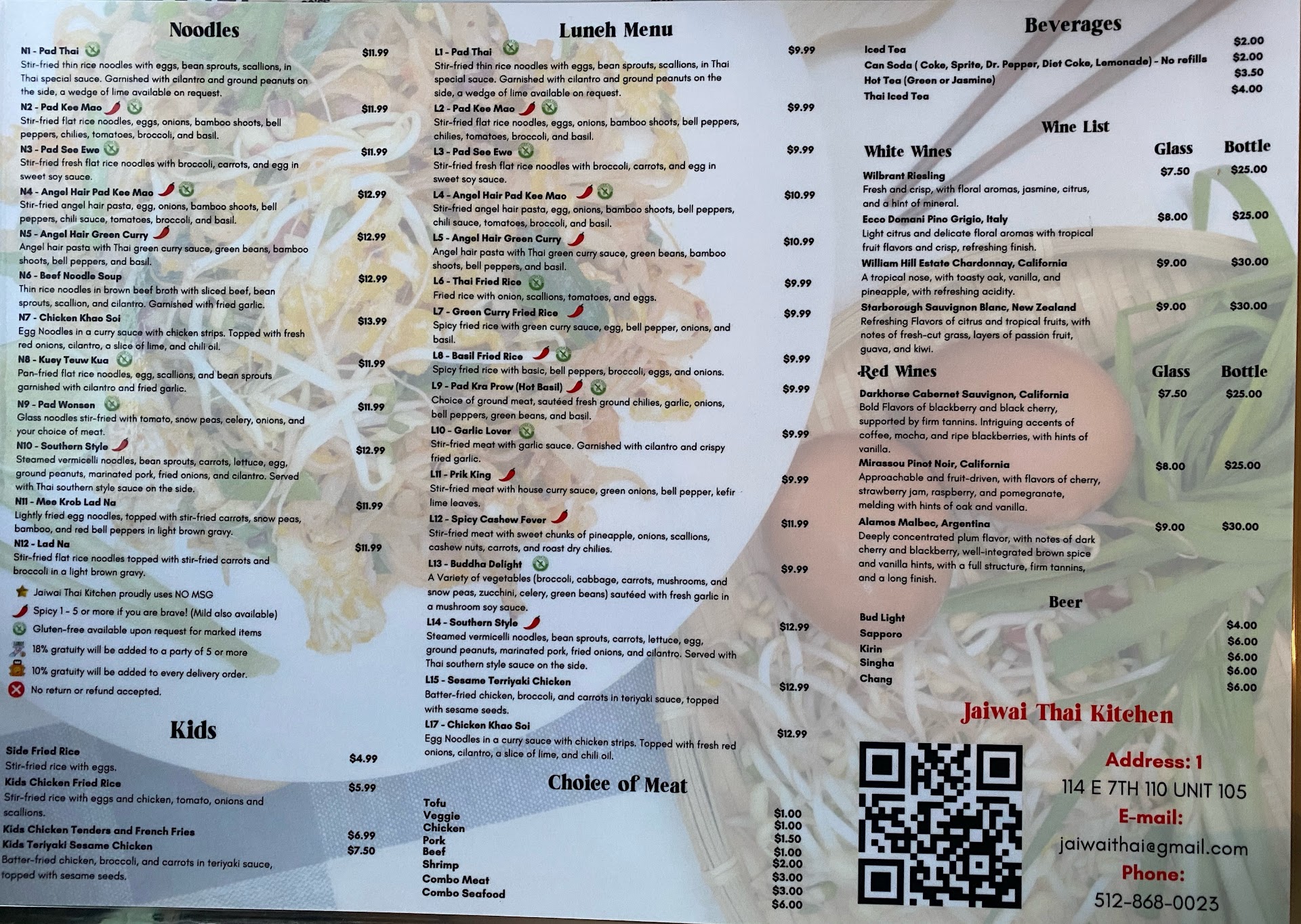Read moreLast night's escapade to Jaiwai Thai Food turned a dreary rainy evening into a culinary adventure we won't soon forget. Tucked away, this gem of a restaurant boasts a quaint ambiance with a mere 15 tables, immediately setting a warm and inviting tone. Adorned with accolades, including the prestigious 'Best of Georgetown' signs, it was clear from the get-go that we were in for a treat.Our evening began the moment we were warmly greeted by Mac, our server, whose attentiveness and enthusiasm added an extra layer of joy to our dining experience. As we perused the menu, our anticipation grew, and rightly so. The shrimp spring rolls were our opening act, arriving perfectly rolled, exuding freshness with each bite. The accompanying peanut sauce was nothing short of divine, striking the perfect balance between sweet and savory, but the culinary journey didn't stop there. The homemade dumplings, evidently crafted with care and skill right in the restaurant, were a revelation, bursting with flavor and setting the stage for the main courses to come. The Pad See Ew was flawlessly executed, each strand of noodle soaking up the rich, complex flavors, a testament to the chef's prowess.However, the pièce de résistance of our meal was, without a doubt, the Green Curry Fried Rice. A dish that masterfully wove together the right amount of spice, incredible flavor, and an aroma that captivated our senses, ensuring that each mouthful was savored and remembered.In conclusion, Jaiwai Thai Food is not just a restaurant; it's a destination for those seeking to immerse themselves in authentic Thai cuisine. From the intimate setting and the friendly service to the exquisite dishes that leave a lasting impression, Jaiwai Thai Food is a must-visit for anyone looking to explore the best of what Thai cuisine has to offer. Whether you're a local or just passing through Georgetown, make sure to add this culinary...