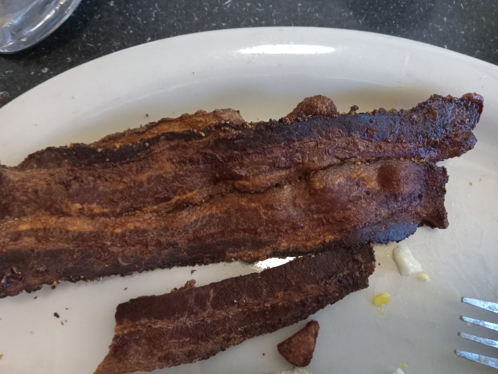 After a few minutes a server brought one plate. It was the one egg and home fries. Talk about dissatisfied and disappointing. Half the egg had dark brown scale over it and the potatoes were cold. Not even a mild warmth to them. Need less to say we sent it back. After several minutes another plate came with the pancake. Surprisingly it was good. It was hot and had a good taste. My order came a few minutes later. The eggs were rimmed with a dry scaly crust. (Really? Who eats this crap?) I took the scale off and had half the egg order I wanted. I don't know about the grits either. Couldn't eat them. I'm not sure what they are made with but the taste was just off from true grits. I ordered crispy bacon. I'm not sure what the defining line is between crispy and burnt but mine was passed crispy and well into the burnt area. Again could not eat. Toast was good and strawberry jam was good. After sending the plate back and not really wanting a second attempt. Valerie, who is apparently in charge of the kitchen, came to our table. We discussed the situation with her and she was very understanding.