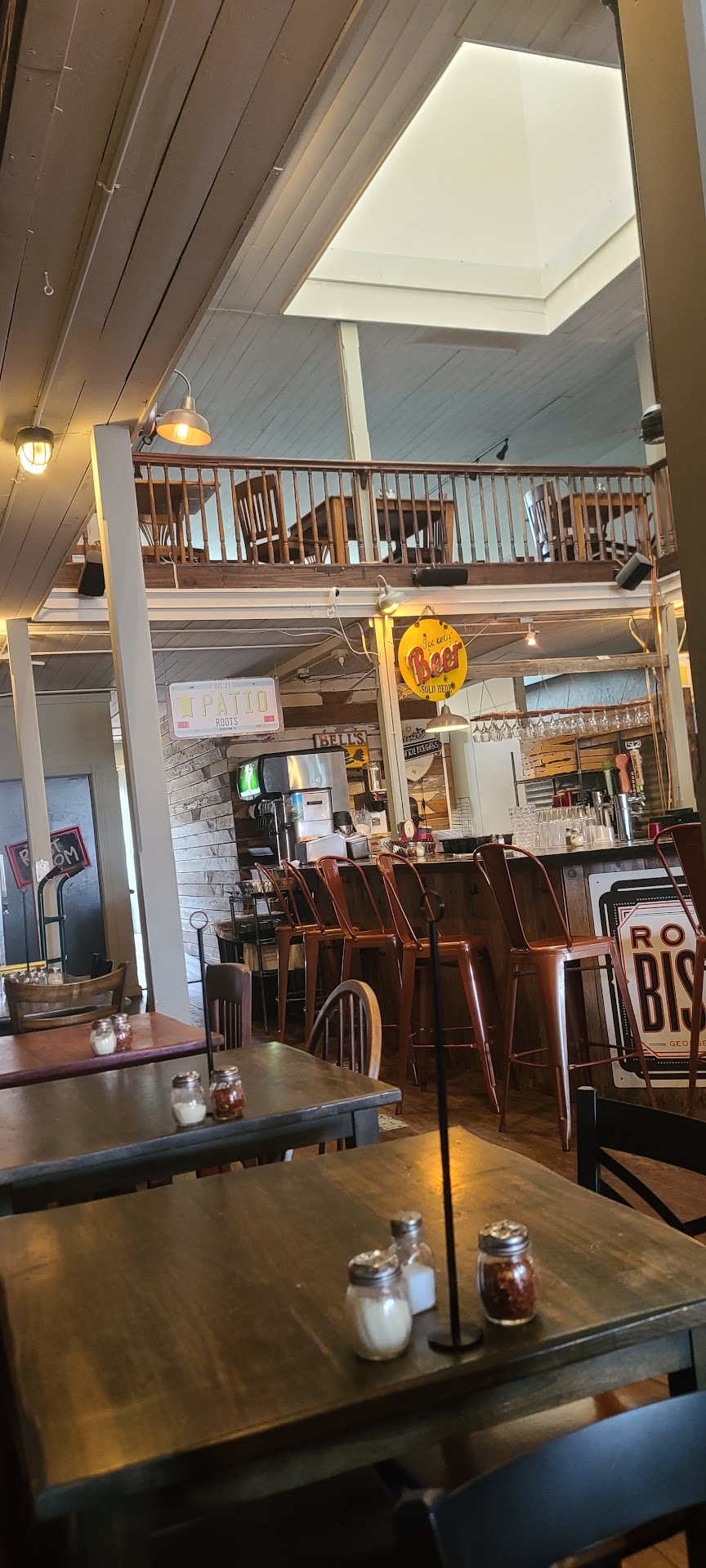 Roots is in the downtown square of Georgetown in a building that is over 100 years old. Parking is challenging around the square, but it is worth finding a spot. The restaurant is a large open space with a second level balcony with additional tables and seating. We stopped by on a Thursday afternoon and there was only one table occupied, so plenty of open seating. There is a small stage by the front door, and I can tell that this place can get crowded, especially when they have live music.