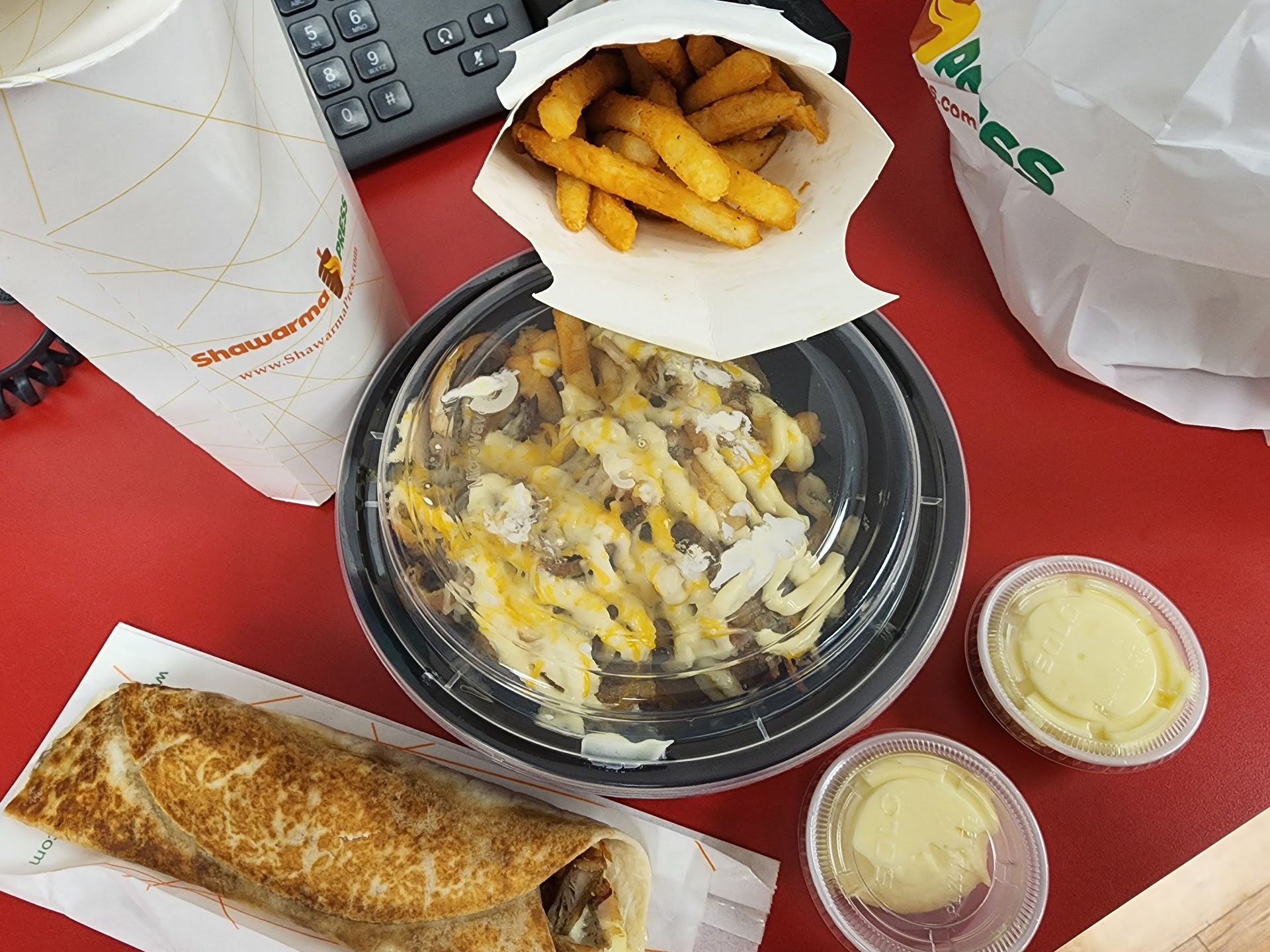 The food was amazing! Sharing with my coworkers, we ordered a chicken shawarma combo, a fries bowl with chicken and some extra fries to pass around. The chicken was flavorful and the fries were some of the best fries I've had in a while. But the garlic sauce was my absolute favorite! An extra side of that sauce is prefect for dipping fries, or if you want to add a little extra fresh garlic flavor to any of the menu items.