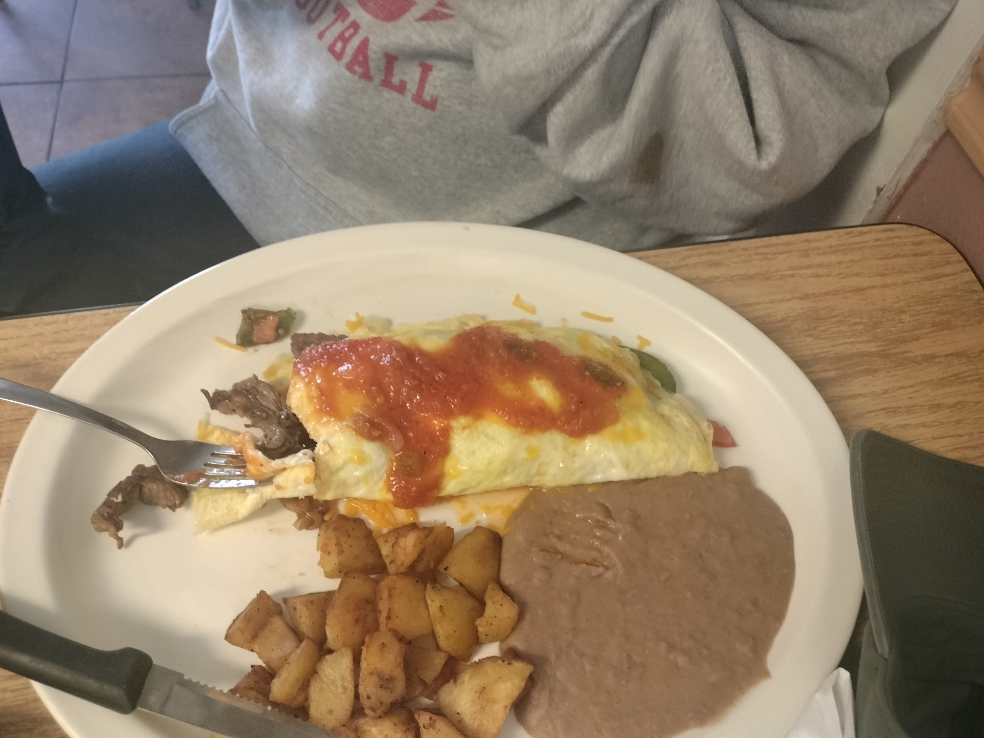 My wife ordered the migas with cheese and immediately declared them the best she’s ever had (and trust me, she’s a professional migas critic at this point). The standout: the migas here use hard-fried tortilla strips, not the usual soft, soggy bits. It added a crunch and texture that took the dish to a whole new level. She wasn’t a fan of the refried beans because they had a heavy pork flavor (she’s vegetarian), but lucky for me — the carnivore at the table — they were delicious.