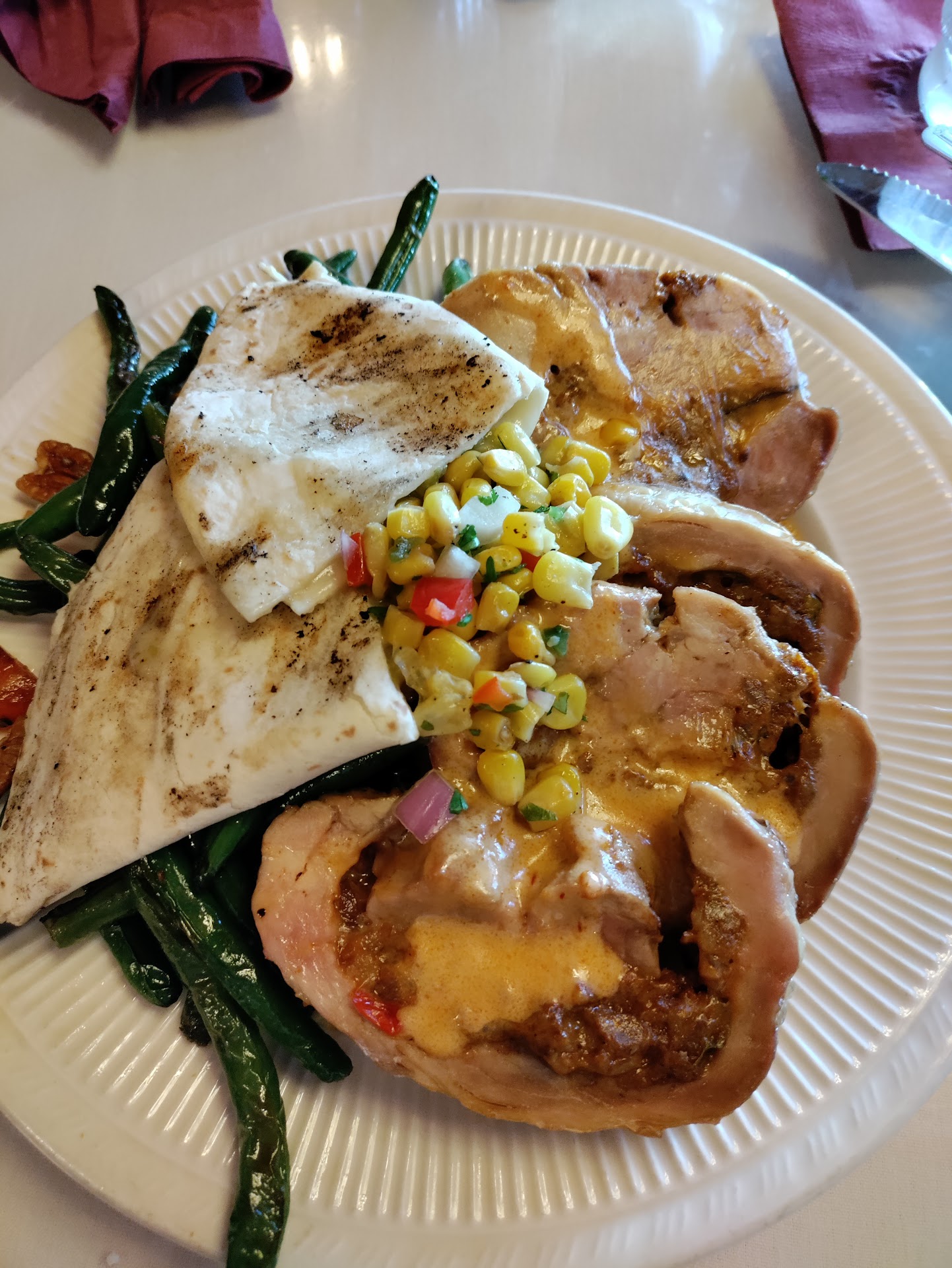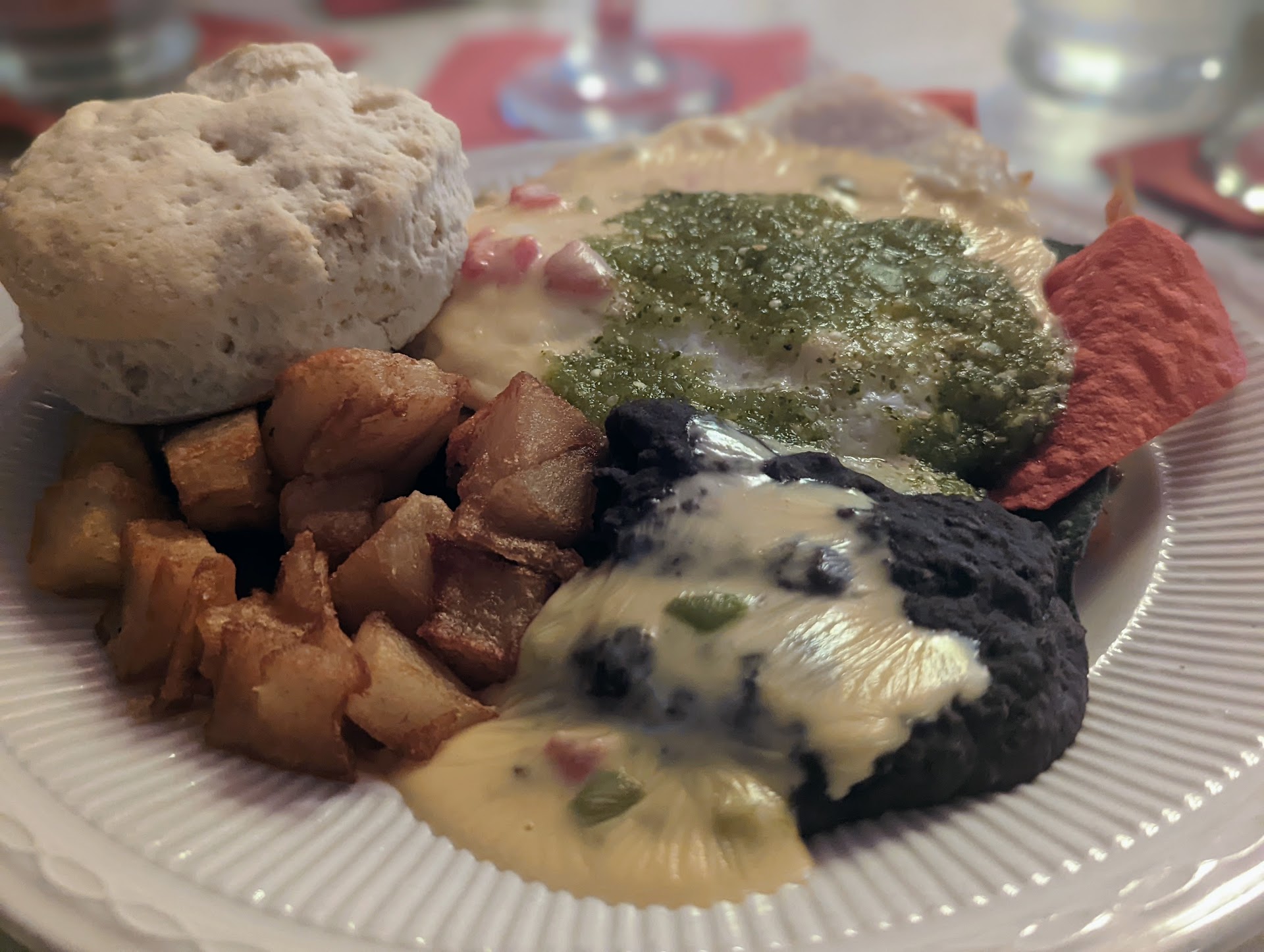 For the meals, a little bit of everything was ordered, but the popular choices were the French Toast, Chilaquiles, Blackened Tuna Salad, and Migas. We also ordered the Pozole and Roasted Corn Shrimp Chowder. With the breakfast options, they brought out a small plate of fruit. For the table, they brought out some scones. The scones were really good, they were warm, fresh, and very flavorful. The fruit was just a few pieces on a plate, but was ok. The Pozole and Chowder were both really good. However, I was disappointed in the Chilaquiles as the chips weren't cooked with the rest of the ingredients, but were cold tortilla chips out of bag and the ingredients served on top similar to nachos. The beans and potatoes served with them were pretty bland as well. I tasted the Blackened Tuna Salad and the the tuna was cooked perfectly and the other ingredients were fresh.