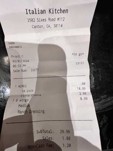 My order was fairly simple a Large The Works, mushrooms on half and extra cheese. I know the young lady heard the extra cheese part, as O was charged for it.