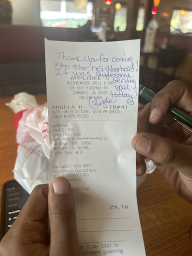 Read moreI recently had the pleasure of dining at the Commerce, GA Applebees, and I must say that the experience was truly elevated by our server, Kaylee. From the moment we were seated, Kaylee’s warm and welcoming demeanor set the tone for N exceptional evening.