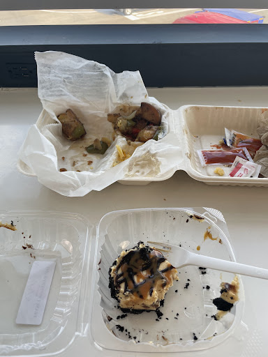 It's in the food court, so it's shared seating. I'm going to whine about the seating only in hopes that someone in airport design finally comes to their senses, but I didn't factor this into my rating of the restaurant itself except for the "atmosphere." It's yet another public area that kind of leaves you wondering if the people designing it have been to an airport before. Or outside at all. They somehow managed to have a bunch of wasted seating while people were also trying to find somewhere to sit. Considering the average group size of the majority of people in the airport (1-2), having mostly full-sized tables designed for 4 people leads to a lot of wasted space. So one side of the food court seating is like being a smelly kid in elementary school. You walk into the cafeteria, and there are technically lots of empty seats, but no one wants you to sit at their table. They did try to maximize seating in other areas by adding bizarre rows of individual chairs on the wall between tables...but not with a table. The charging counters a few feet away with individual seats were mostly full. Had they taken that same concept and flipped all the single chairs around with at least some counter space, they could comfortably accommodate a lot more people who could actually eat. You know what's not very practical or enjoyable? Sitting awkwardly in a chair between two tables of other people eating, trying to eat rotisserie chicken and rice with no table to put the...