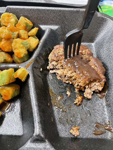 I ordered the Hamburger Steak Platter with fried okra, a side salad, and fried pickles. And while my Granny did cross my mind when the food arrived, it was more in the sense of wondering if this is what sheâd have been forced to eat had she ever ended up in a nursing home. I opted out of grilled onions on my hamburger steak, but I didnât realize that meant Iâd be served a plain, dry burger patty with nothing to dress it up. When I asked about gravy, I was told the only options were A1 or Heinz 57âbless it.