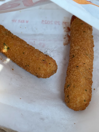 Read moreThis is my second visit to this location. I placed an order for my wife and myself. When I received my drink cup I went to the drink counter. I poured ice and then noticed a brown/black substance on the plastic reservoir. My first thought was mold. I immediately dumped the ice and used the other one. In retrospect I should have gotten another cup. Meanwhile as I was sitting down my wife was heading back to the counter to return cold mozzarella sticks. The kind, older Hispanic woman brought out a new package. They were hot, as should original package have been. She ate one then gave me 3. Then she showed me what I thought was a growth in the marinara cup. She stated that it was hair, that would not have been hers(wrong color/texture) I’m bald so it couldn’t have been mine. As we’re leaving, not desiring any kind of fallout, just bringing this gross experience to the attention of the management, she encountered a younger Hispanic female actually insinuated that my wife was lying, (we don’t have anyone working here with that type of hair). We departed, never to return again. If you zoom out, you can clearly see the hair on the cheese stick, a thin, black silky sort of texture. There will be no law suit coming forth. But, this was definitely an...