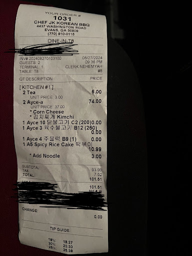 Read moreI love Korean Bbq, so I was so excited to try this Chef JK. Let me start by saying that food is one of the better tasting Korean cuisine here in Augusta. However, my dining experience is far from amazing. When we arrived, the restaurant didn't seem to be packed, but there were two servers working, so we understood that service could be slower than usual. There was no "welcoming" atmosphere coming from the two servers, while one of them seemed like she hated working there. She walks slow, and her voice sounds like she just hates talking to people. It was our first time so we do have some questions about the menu, but our server just either nods or shakes her head, and she didn't further explain the menu like she expects us to already know the answer. During the entire duration of our dining, there was no time that our server asked if there's anything more that we needed or if the food was good. Although, we observed that they were nice and welcoming in one of the tables. We began to think they don't like us being there. As we ran out of our sides, our server just passed by without checking on us. We have to ask her attention, and she just responds with her usual unenthusiastic voice. It made us feel awkward to order more good or drinks. So we just decided to go after eating half of our orders. It's sad because the chef or the owner seems to be a good person and very cheerful. Maybe we just had a unique experience that didn't really reflect the service of the restaurant, but we are definitely not going to eat...
